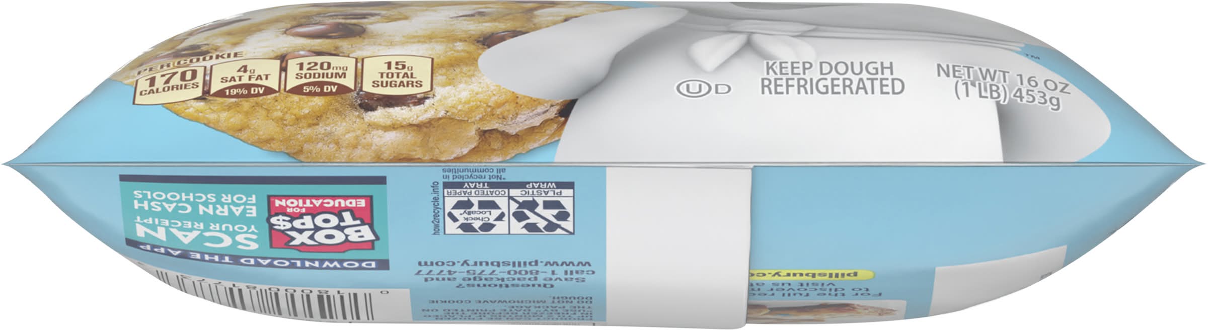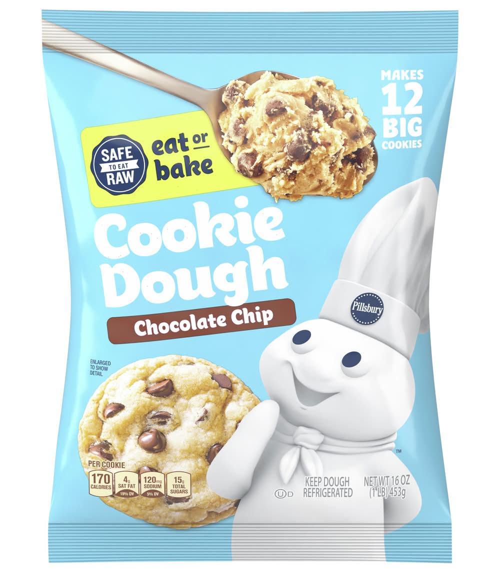 Add sweet joy to seasonal get-togethers with Pillsbury Ready to Bake Chocolate Chip Cookie Dough. It's made with real chocolate and without high fructose corn syrup or colors from artificial sources. You can have chocolate chip cookies ready in minutes with no mixing, no mess. Serve baked Pillsbury cookies for a holiday party, cookie exchange, or goodie bag treats. Use refrigerated cookie dough to make holiday dessert bars. Finished Pillsbury cookies make great food gifts for friends and family. Cookies are a great way to bring crowd-pleasing treats to a Thanksgiving food table, party snacks spread, gift basket, or care package. You can even eat the refrigerated cookie dough uncooked (look for the "safe to eat raw" seal!). At Pillsbury, we strive to make home baked moments extra special through our products and recipes, which help make cooking and baking easy and convenient for even the busiest families. Contains one package of Pillsbury Ready to Bake Cookie Dough, Chocolate Chip, Makes 12 Big Cookies, 16 oz. • Flavor: Chocolate chip • Packaging: Reusable