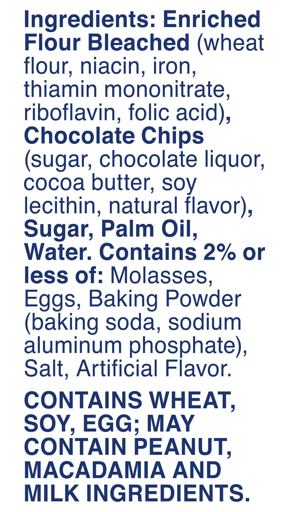 Ingredients: Enriched Flour Bleached (Wheat Flour, Niacin, Iron, Thiamin Mononitrate, Riboflavin, Folic Acid), Chocolate Chips (Sugar, Chocolate Liquor, Cocoa Butter, Soy Lecithin, Natural Flavor), Sugar, Palm Oil, Water. Contains 2% or Less of: Molasses, Eggs, Baking Powder (Baking Soda, Sodium Aluminum Phosphate), Salt, Artificial Flavor Contains: Wheat, Soybeans, Eggs, Peanuts, Tree Nuts, Macadamia Nuts, Milk