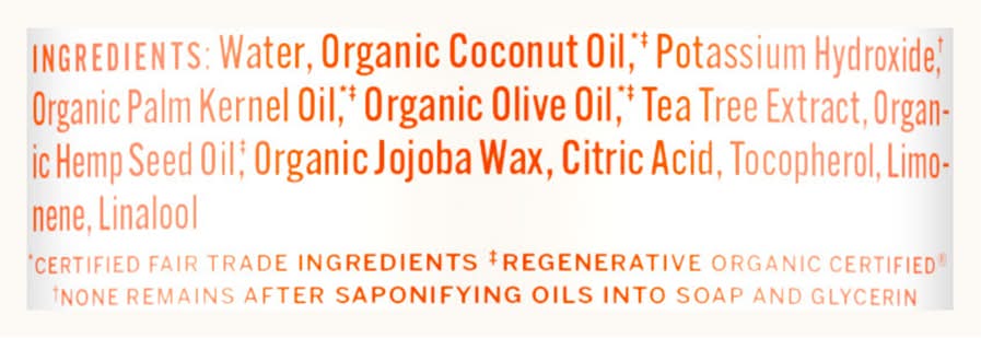 Ingredients: Water, Organic Coconut Oil*(a), Potassium Hydroxide(b), Organic Palm Kernel Oil*(a), Organic Olive Oil*(a), Tea Tree Extract, Organic Hemp Seed Oil(a), Organic Jojoba Wax, Citric Acid, Tocopherol, Limonene, Linalool. *Certified Fair Trade Ingredients. (a)Regenerative Organic Certified. (b)None Remains After Saponifying Oils Into Soap and Glycerin Contains: Tree Nuts