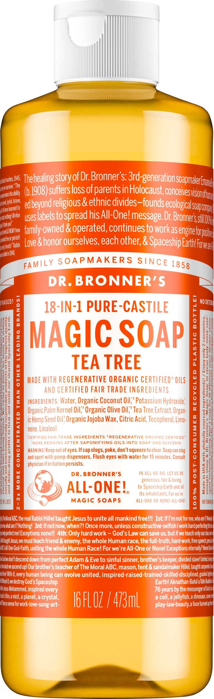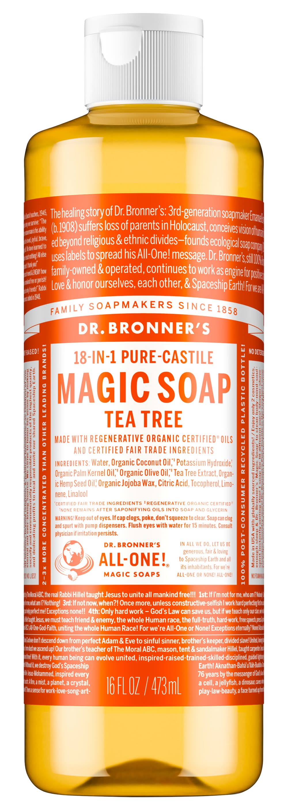 18-in-1 Pure-Castile Tea Tree Magic Soap • Dr. Bronner's, P.O. Box 1958,Vista,CA,92085,USA • Packaging: Reusable
