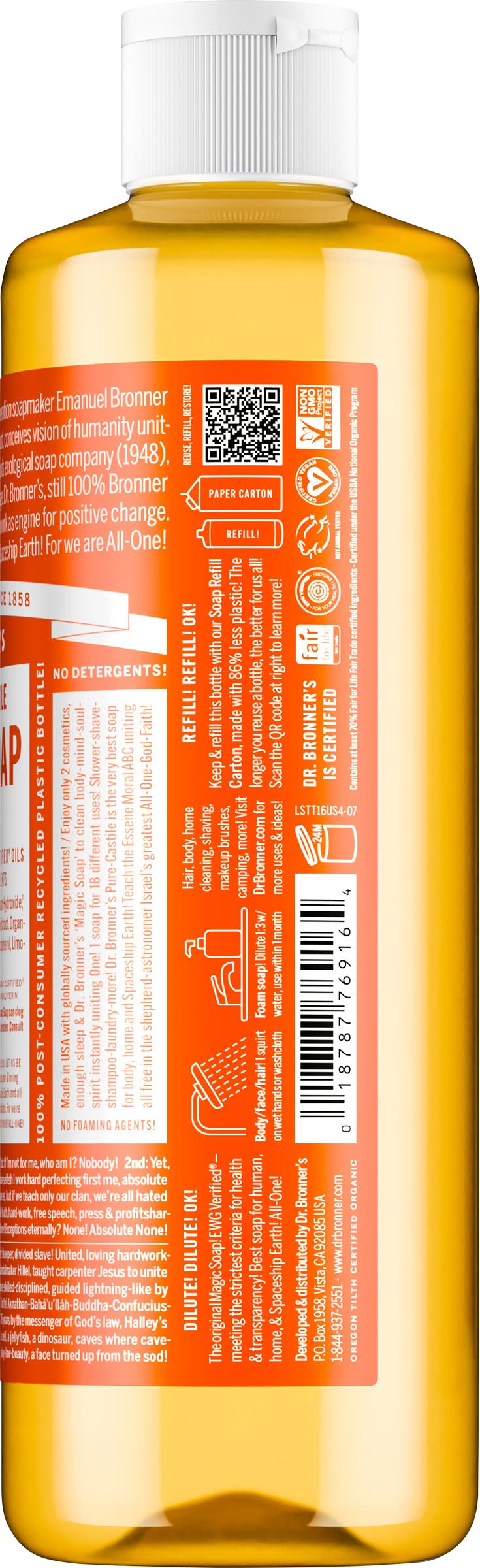 Usage of instructions:dilute with water. clouds when cold. put in warm room/water: clears at about 70 degrees f. enjoy only 2 cosmetics, enough sleep & dr. bronner's magic soap to clean body-mind-soul-spirit instantly uniting one! absolute cleanliness is godliness! for facial packs, scalp & soothing body rub, add dash on bath towel in sink of hot water. wring out. lay over face & scalp. massage with finger-tips. repeat 3 or 4 times til arms, legs & all are rubbed, always towards the heart. rinse towel in plain hot water and massage again. breathe deeply! dilute: enjoy 1 soap for 18 different uses! shave-shampoo-shower-bath-mop-launder-degrease! dr. bronner's pure-castile is the very best soap for body, home and spaceship earth! synthetic preservatives? detergents? foaming agents? none! health is our greatest wealth! enjoy body rub to stimulate body-mind-soul-spirit and teach the essene moral abc uniting all free in the shepherd-astronomer israel's greatest all-one-god-faith! dilute! dilute! ok! 1. one small squirt applied to wet washcloth to wash hands-face-body. 2. work 1/2 tbsp. into wet hair, rinse with dr. bronner's organic hair rinse. 3. dilute 1:10 with water for hand-washed dishes, best in soft water. 4. for laundry, 1/3-1/2 c. soap in large load, add 1/2 c. vinegar in rinse cycle. 5. mop floor with 1/2 c. soap diluted in 3 gal. of hot water. 6. wash dog by wetting fur, massage soap in for good lather, rinse well. 7. a dash in bowl of water to remove residue from fruit & veggies. rinse clean. 8. all-purpose cleaner: add 4 c. of soap to qt. of water in spray bottle. 9. one tbsp. in qt. of water to spray plants for bugs. dash of cayenne optional. 10 shave face-underarms-legs: lather up 5-10 drops in wet hands, apply. conserve-save: refill gallon or from drum at store! ok! - directions: lute with water. clouds when cold. put in warm room/water: clears at about 70 degrees f. enjoy only 2 cosmetics, enough sleep & dr. bronner's magic soap to clean body-mind-soul-spirit instantly uniting one! absolute cleanliness is godliness! for facial packs, scalp & soothing body rub, add dash on bath towel in sink of hot water. wring out. lay over face & scalp. massage with finger-tips. repeat 3 or 4 times til arms, legs & all are rubbed, always towards the heart. rinse towel in plain hot water and massage again. breathe deeply! dilute: enjoy 1 soap for 18 different uses! shave-shampoo-shower-bath-mop-launder-degrease! dr. bronner's pure-castile is the very best soap for body, home and spaceship earth! synthetic preservatives? detergents? foaming agents? none! health is our greatest wealth! enjoy body rub to stimulate body-mind-soul-spirit and teach the essene moral abc uniting all free in the shepherd-astronomer israel's greatest all-one-god-faith! dilute! dilute! ok! 1. one small squirt applied to wet washcloth to wash hands-face-body. 2. work 1/2 tbsp. into wet hair, rinse with dr. bronner's organic hair rinse. 3. dilute 1:10 with water for hand-washed dishes, best in soft water. 4. for laundry, 1/3-1/2 c. soap in large load, add 1/2 c. vinegar in rinse cycle. 5. mop floor with 1/2 c. soap diluted in 3 gal. of hot water. 6. wash dog by wetting fur, massage soap in for good lather, rinse well. 7. a dash in bowl of water to remove residue from fruit & veggies. rinse clean. 8. all-purpose cleaner: add 4 c. of soap to qt. of water in spray bottle. 9. one tbsp. in qt. of water to spray plants for bugs. dash of cayenne optional. 10 shave face-underarms-legs: lather up 5-10 drops in wet hands, apply. conserve-save: refill gallon or from drum at store! ok! good for 24 months once opened.