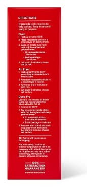Whether it's game day, movie night or just time for a snack, frozen Mozzarella Cheese Sticks from market pantry™ are sure to hit the spot. This frozen appetizer pack contains about 10 servings of mozzarella cheese sticks with a tasty breading, resulting in a pleasant and delicious combo of textures — gooey cheese and crisp breading — when the frozen cheese sticks are cooked. Simply pop them in the oven or a deep fryer to fully cook them, then serve with marinara sauce or ranch dressing. The party pack size gives you plenty to serve as an appetizer for a get-together or to treat your family to a cheesy snack a couple days in a row. Directions Mozzarella sticks need to be fully cooked. Keep frozen until ready to prepare. Oven 1. Preheat oven to 450F. 2. Place mozzarella sticks in a single layer on baking sheet. 3. Bake on middle oven rack until hot throughout and golden brown. 10 mozzarella sticks -- 10 minutes Entire package -- 15 minutes 4. Let stand 2 minutes: cheese will be hot. Air Fryer 1. Preheat air fryer to 360°F according to manufacturer’s instructions. 2. Arrange 6 mozzarella sticks in a single layer in basket. 3. Air-fry for 6 to 7 minutes or until hot. 4. Let stand 2 minutes: cheese will be hot. Deep Fry Caution: Ice crystals on frozen foods can cause spattering when added to hot oil. 1. Heat oil to 350F. 2. Fry frozen mozzarella sticks until hot throughout and deep golden brown. 10 mozzarella sticks -- 2 minutes 45 seconds Entire package -- 4 minutes 3. Remove from hot oil and drain on paper towel-lined plate. Let stand 2 minutes: cheese will be hot. For food safety, cook to an internal temperature of 165F as measured with a food thermometer. Appliances may vary; adjust accordingly. Refrigerate or discard leftovers immediately. Tip - Serve with pasta sauce for dipping. "