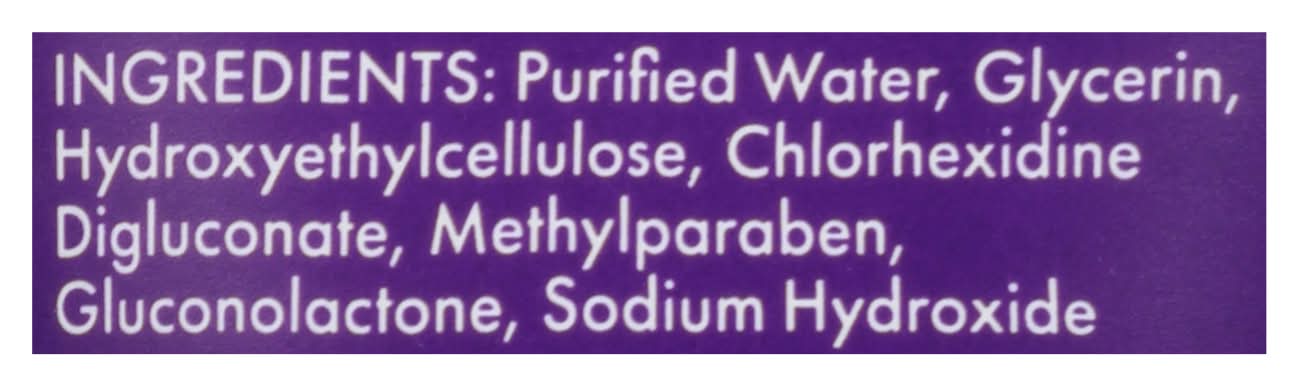 Ingredients: Purified Water, Glycerin, Hydroxyethylcellulose, Chlorhexidine Digluconate, Methylparaben, Gluconolactone, Sodium Hydroxide