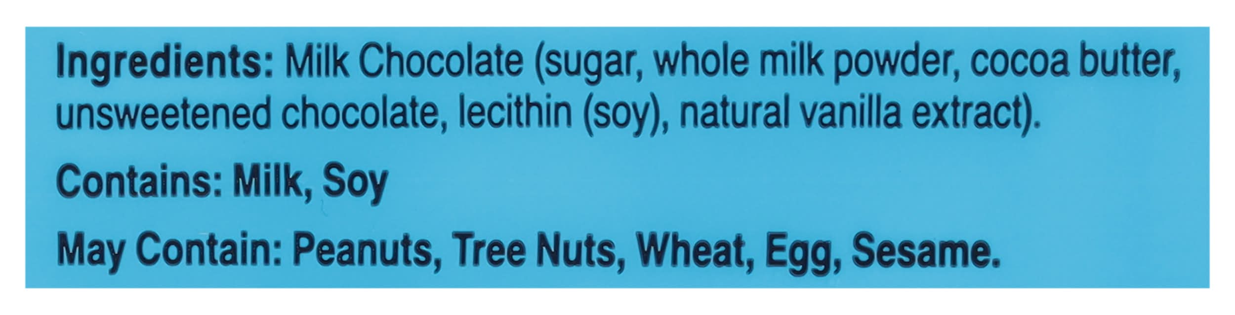Ingredients: Milk Chocolate (Sugar, Whole Milk Powder, Cocoa Butter, Unsweetened Chocolate, Lecithin (Soy), Natural Vanilla Extract) Contains: Milk, Soybeans, Peanuts, Tree Nuts, Wheat, Eggs, Sesame