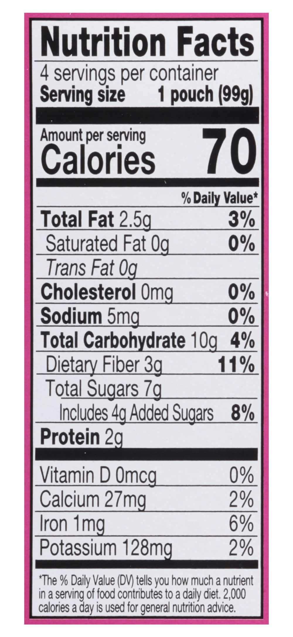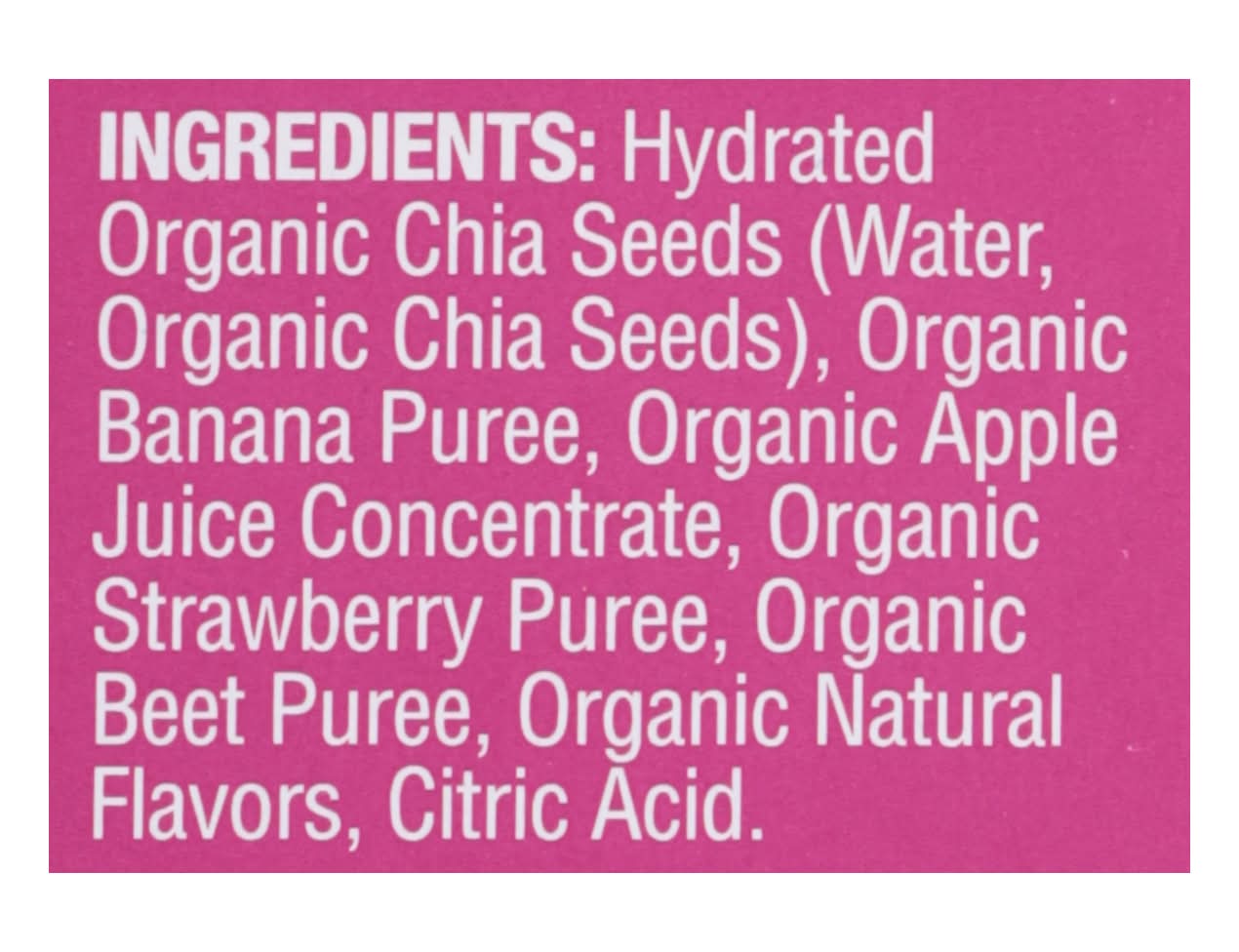 Ingredients: Hydrated Organic Chia Seeds (Water, Organic Chia Seeds), Organic Banana Puree, Organic Apple Juice Concentrate, Organic Strawberry Puree, Organic Beet Puree, Organic Natural Flavors, Citric Acid