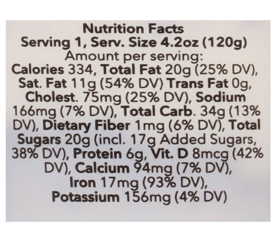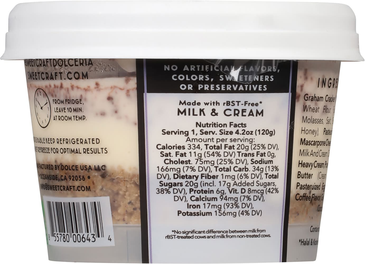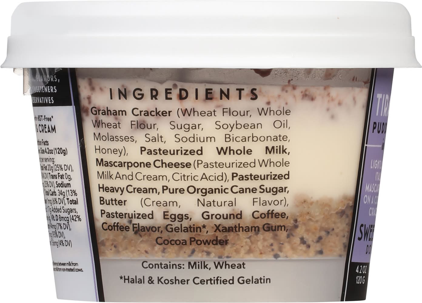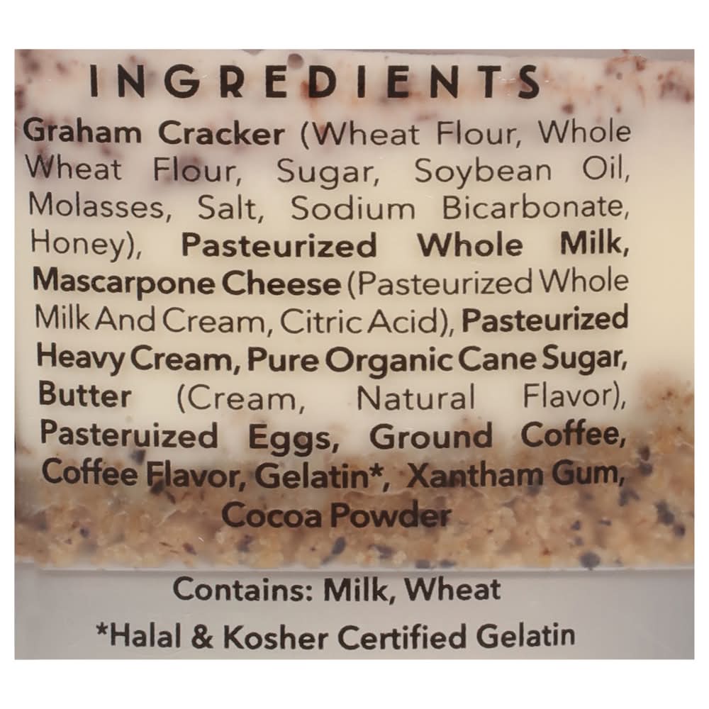 Ingredients: Graham Cracker (Wheat Flour, Whole Wheat Flour, Sugar, Soybean Oil, Molasses, Salt, Sodium Bicarbonate, Honey), Pasteurized Whole Milk, Mascarpone Cheese (Pasteurized Whole Milk and Cream, Citric Acid), Pasteurized Heavy Cream, Pure Organic Cane Sugar, Butter (Cream, Natural Flavor), Pasteruized Eggs, Ground Coffee, Coffeel5lavor, Gelatin*, Xantham Gum, Cocoa Powder. *Halal & Kosher Certified Gelatin Contains: Milk, Wheat