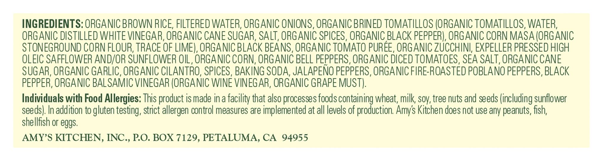 Ingredients: ORGANIC BROWN RICE, FILTERED WATER, ORGANIC ONIONS, ORGANIC BRINED TOMATILLOS (ORGANIC TOMATILLOS, WATER, ORGANIC DISTILLED WHITE VINEGAR, ORGANIC CANE SUGAR, SALT, ORGANIC SPICES, ORGANIC BLACK PEPPER), ORGANIC CORN MASA (ORGANIC STONEGROUND CORN FLOUR, TRACE OF LIME), ORGANIC BLACK BEANS, ORGANIC TOMATO PURÉE, ORGANIC ZUCCHINI, EXPELLER PRESSED HIGH OLEIC SAFFLOWER AND/OR SUNFLOWER OIL, ORGANIC CORN, ORGANIC BELL PEPPERS, ORGANIC DICED TOMATOES, SEA SALT, ORGANIC CANE SUGAR, ORGANIC GARLIC, ORGANIC CILANTRO, SPICES, BAKING SODA, JALAPEÑO PEPPERS, ORGANIC FIRE-ROASTED POBLANO PEPPERS, BLACK PEPPER, ORGANIC BALSAMIC VINEGAR (ORGANIC WINE VINEGAR, ORGANIC GRAPE MUST). Contains: 'Corn Contains', 'Wheat May Contain', 'Milk May Contain', 'Soybeans May Contain', 'Tree Nuts May Contain', 'Milk Free From', 'Gluten Free From', 'Peanuts Free From', 'Fish Free From', 'Crustacean Shellfish Free From', 'Eggs Free From'