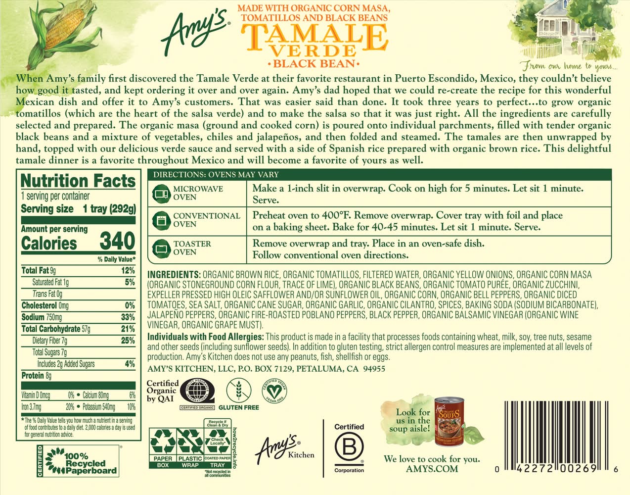 Amy's Vegan Dairy & Gluten Free Black Bean Tamale Verde (10.3 oz)