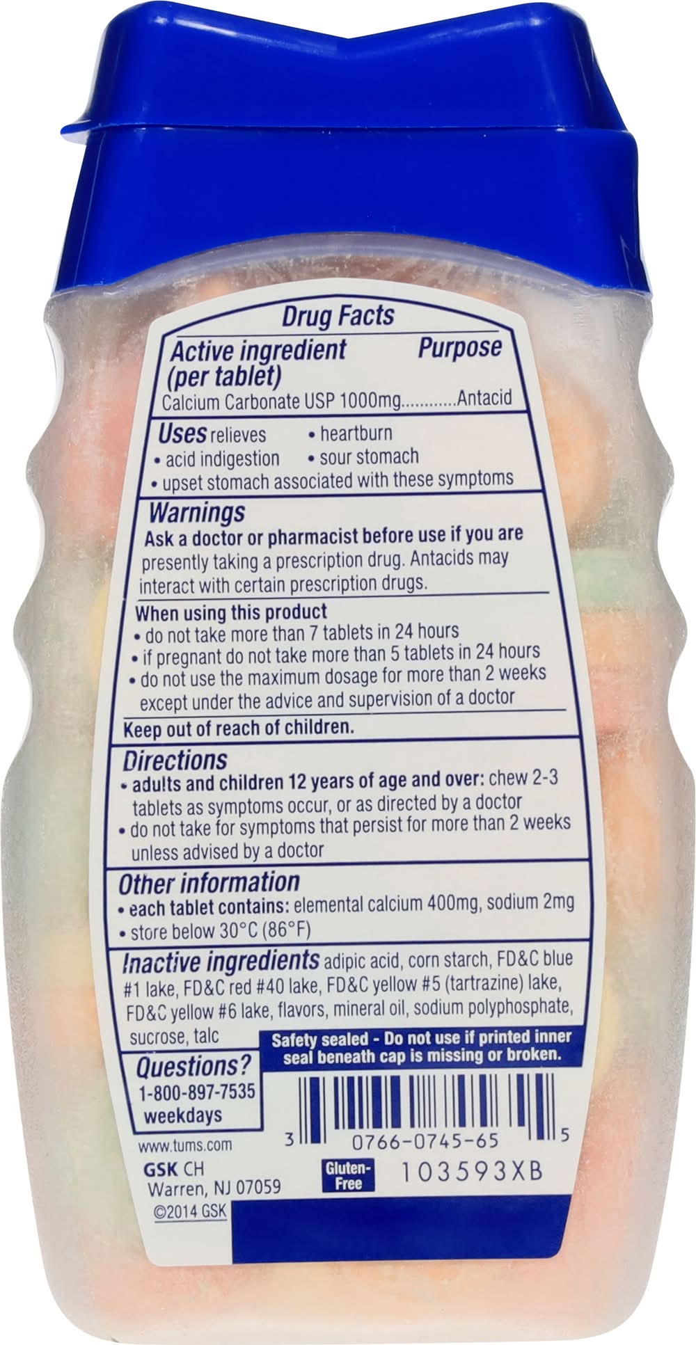 Ingredients: Active Ingredients: (per tablet) Calcium Carbonate USP 1000 mg - Antacid; Inactive Ingredients: Adipic acid, corn starch, FDC blue #1 lake, FDC red #40 lake, FDC yellow #5 (tartrazine) lake, FDC yellow #6 lake, flavors, mineral oil, sodium polyphosphate, sucrose, talc. Additives: Inactive Ingredients: Adipic Acid, Corn Starch, FD&C Blue 1 Lake, FD&C Red 40 Lake, FD&C Yellow 5 (Tartrazine) Lake, FD&C Yellow 6 Lake, Flavors, Mineral Oil, Sodium Polyphosphate, Sucrose, Talc.