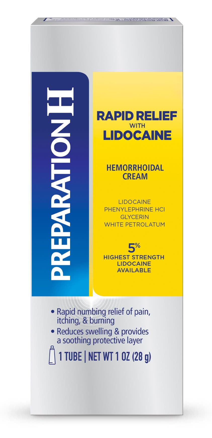 Preparation H Rapid Relief Hemorrhoid Cream with Lidocaine offers fast numbing relief of pain, itching and burning caused by hemorrhoids. Even mild irritation around the butt can be an uncomfortable and persistent problem. When other hemorrhoid creams aren't providing the comfort you need, this skin treatment combines the relief you trust from Preparation H hemorrhoid care products with maximum strength lidocaine cream and phenylephrine help numb skin and reduce swelling. Plus, skin protectants including glycerin provide a soothing, protective layer and promote healing back there. Apply this itch relief cream up to 4 times daily for fast acting hemorrhoid care. Get comfortable with it, with hemorrhoid relief from Preparation H, the number 1 doctor recommended brand for hemorrhoid treatment (1). (1) Among OTC brands GSK Consumer Healthcare, Warren, NJ ,07059