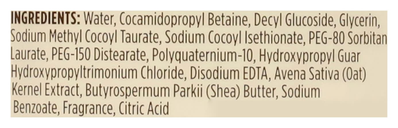 Ingredients: Water, Cocamidopropyl Betaine, Decyl Glucoside, Glycerin, Sodium Methyl Cocoyl Taurate, Sodium Cocoyl Isethionate, PEG-80 Sorbitan Laurate, PEG-150 Distearate, Polyquaternium-10, Hydroxypropyl Guar Hydroxypropyltrimonium Chloride, Disodium EDTA, Avena Sativa (Oat) Kernel Extract, Butyrospermum Parkii (Shea) Butter, Sodium Benzoate, Fragrance, Citric Acid