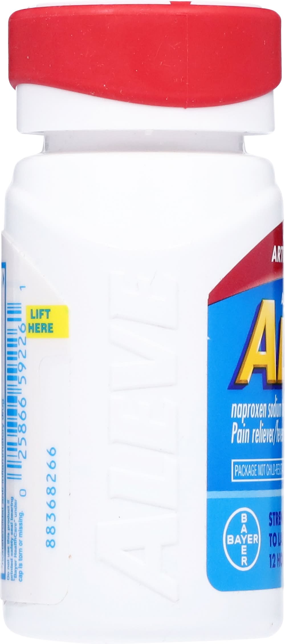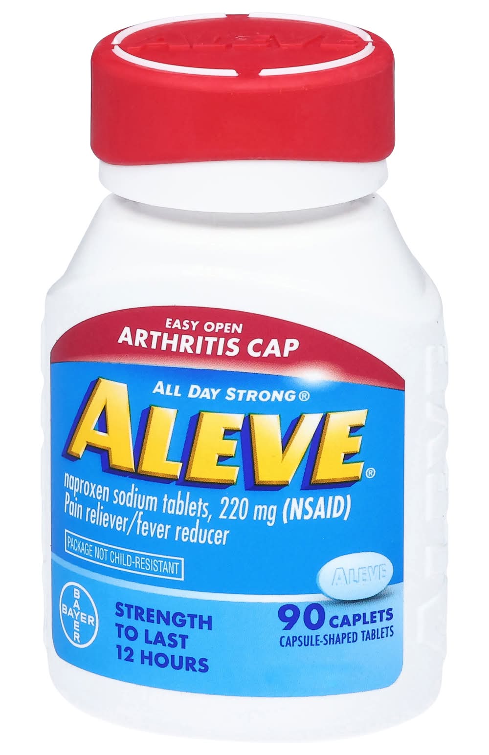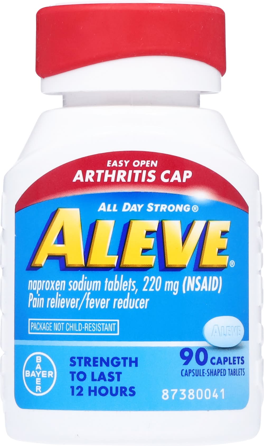 Aleve Caplets with Easy Open Arthritis Cap are made with naproxen sodium to help you manage pain all day with just one pain relief pill. Each naproxen sodium 220 mg caplet has the strength to provide uninterrupted pain relief for up to 12 hours and reduces fever. Aleve Caplets temporarily relieve minor aches and pains due to minor arthritis, as well as muscular aches, backache, menstrual cramps, headache, toothache, and the common cold. This pain medication comes in a small, easy to swallow caplet. The easy-open bottle is arthritis-friendly and fits comfortably in the palm of your hand. Pain happens. Aleve it. Use as directed for minor aches and pains. Package is not child-resistant. *Among OTC Pain Reliever brands** **IQVIA, Arthritic Pain Relief Products, 12 months ending Q4 2022 †Based on clinical study vs. Hydrocodone + Acetaminophen during the first 4 hours after initial dosing Packaging: Reusable