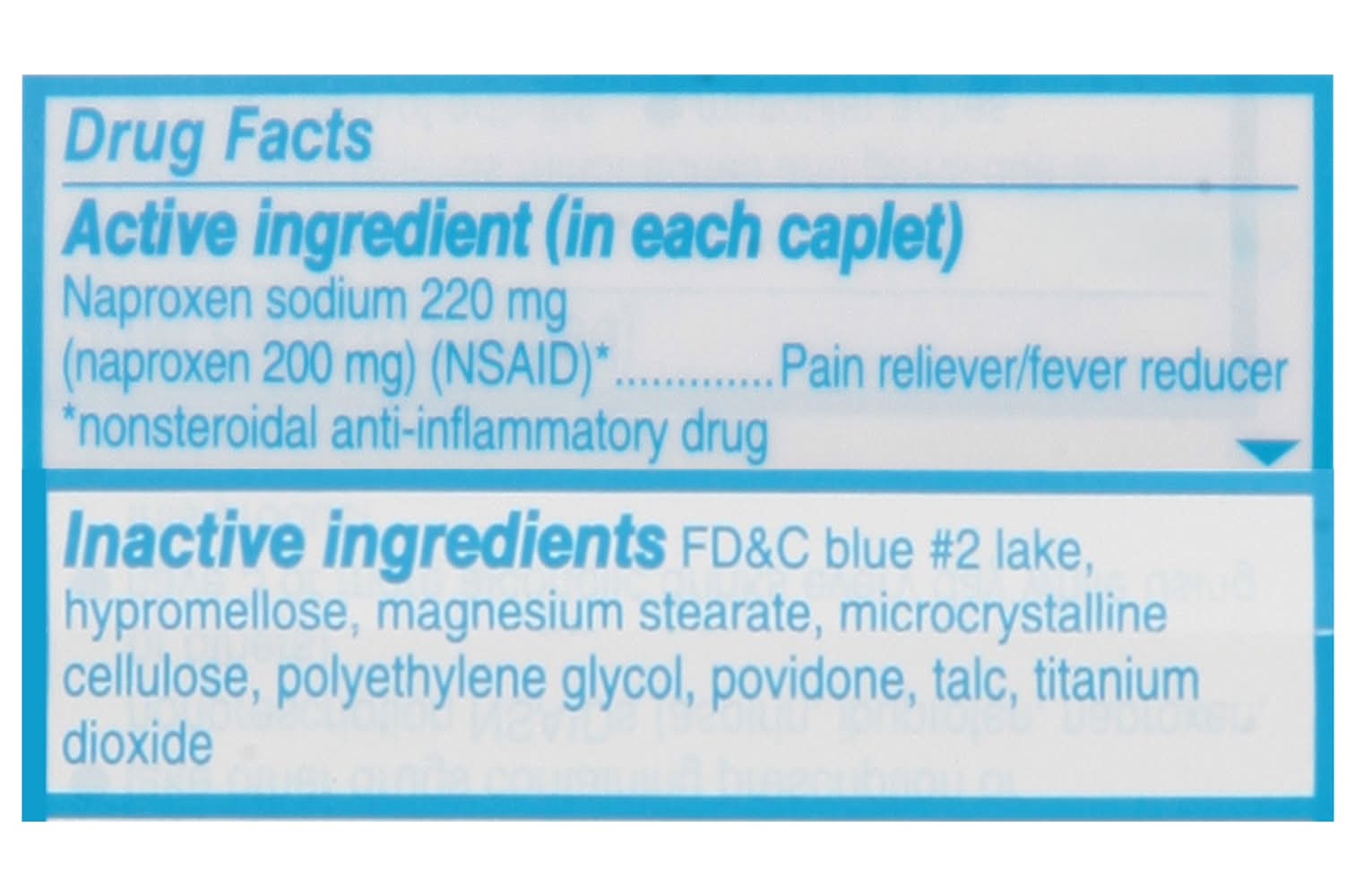 Ingredients: Active Ingredients: Naproxen Sodium 220mg (Naproxen 200 mg) (NSAID) (Nonsteroidal anti-inflammatory drug) (220 mg), Pain reliever/Fever reducer. Inactive Ingredients: FD&C Blue 2 Lake, Hypromellose, Magnesium Stearate, Microcrystalline Cellulose, Polyethylene Glycol, Povidone, Talc, Titanium Dioxide Additives: FD&C Blue 2 Lake, Hypromellose, Magnesium Stearate, Microcrystalline Cellulose, Polyethylene Glycol, Povidone, Talc, Titanium Dioxide