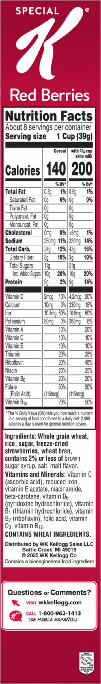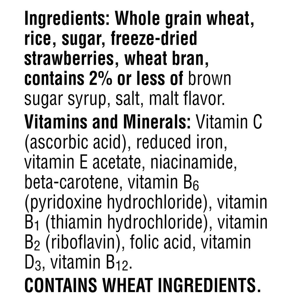 Ingredients: Whole Grain Wheat, Rice, Sugar, Freeze-Dried Strawberries, Wheat Bran, Contains 2% or Less of Brown Sugar Syrup, Salt, Malt Flavor. Vitamins and Minerals: Vitamin C (Ascorbic Acid), Reduced Iron, Vitamin E Acetate, Niacinamide, Beta-Carotene, Vitamin B6 (Pyridoxine Hydrochloride), Vitamin B1 (Thiamin Hydrochloride), Vitamin B2 (Riboflavin), Folic Acid, Vitamin D3, Vitamin B12 Contains: Wheat