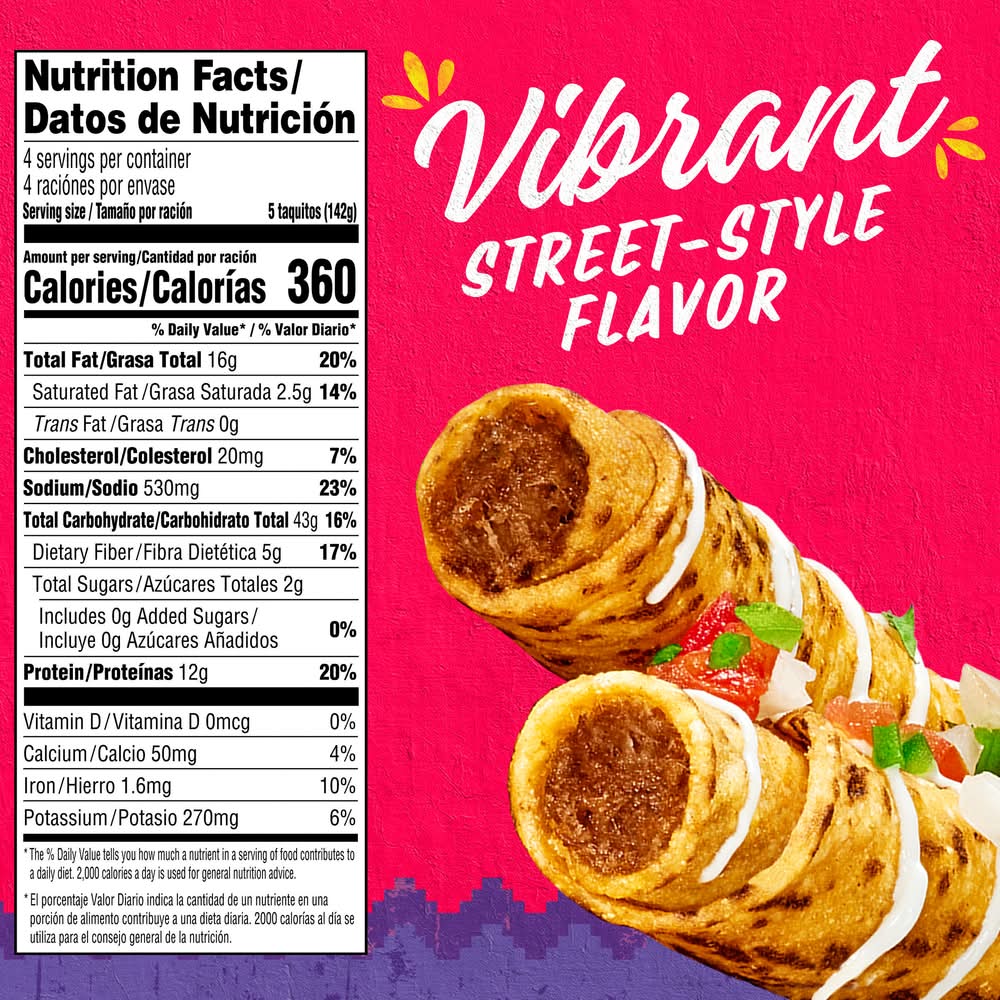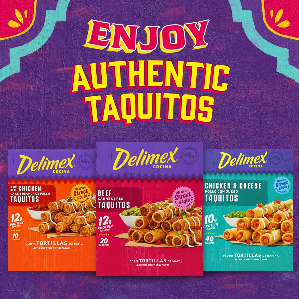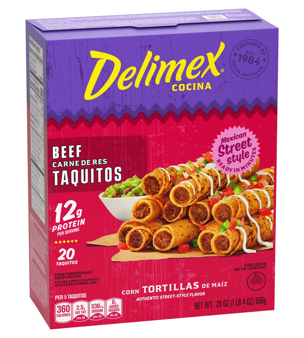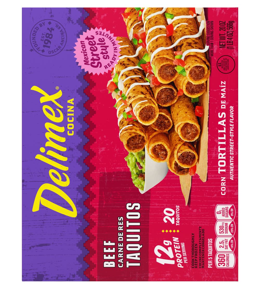 Taste the tradition of authentic, street-style Mexican flavors with Delimex Beef Taquitos. Oscar Ancira Sr. founded Delimex in 1984, using Mexican-inspired ingredients and traditional recipes to recreate the savory taste of street-style taco shops. Our frozen taquitos are made with shredded beef and seasoned with Mexican-style spices and wrapped in a crispy corn tortilla. Delimex taquitos can be prepared in the microwave, oven or air fryer, and are ready in minutes. Enjoy our taquitos as an appetizer, snack or part of your dinner, served with salsa, guacamole and sour cream. In each mouthwatering bite, you'll taste the original ingredients that you find in Mexican kitchens. Each contains 4 servings, with 12 grams of protein per serving. Store our frozen taquitos in the freezer until ready to prepare.