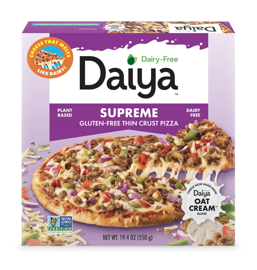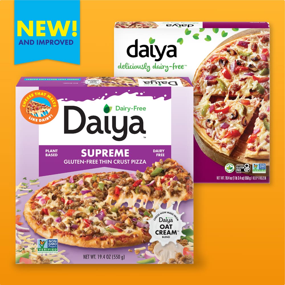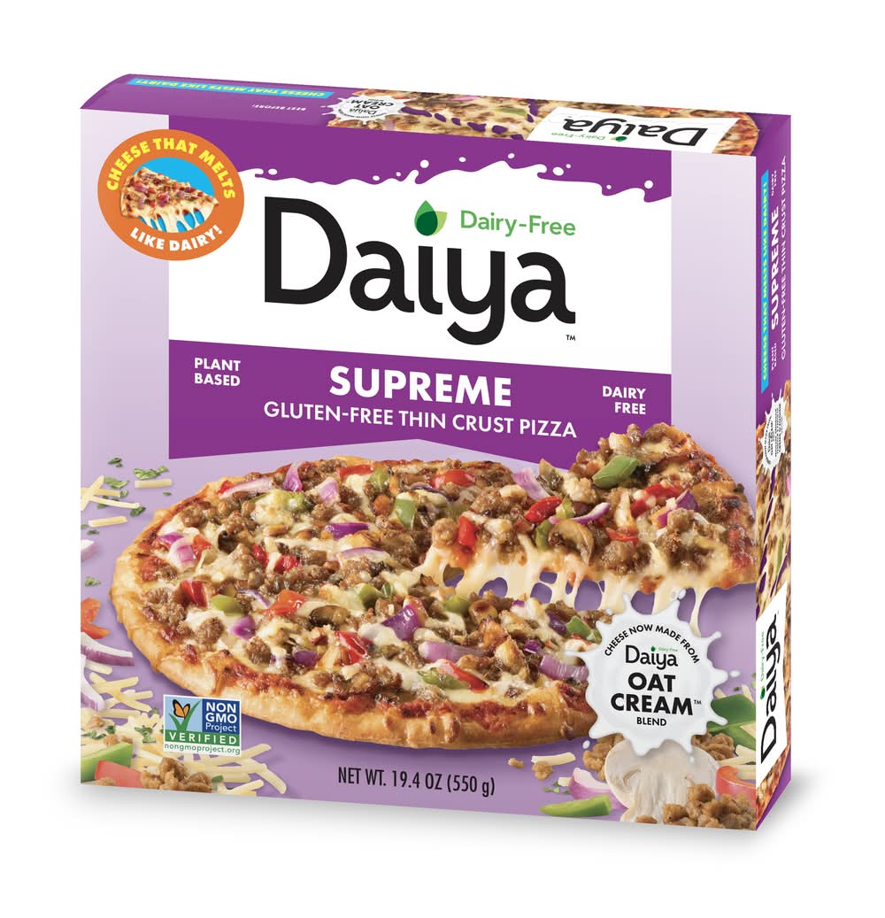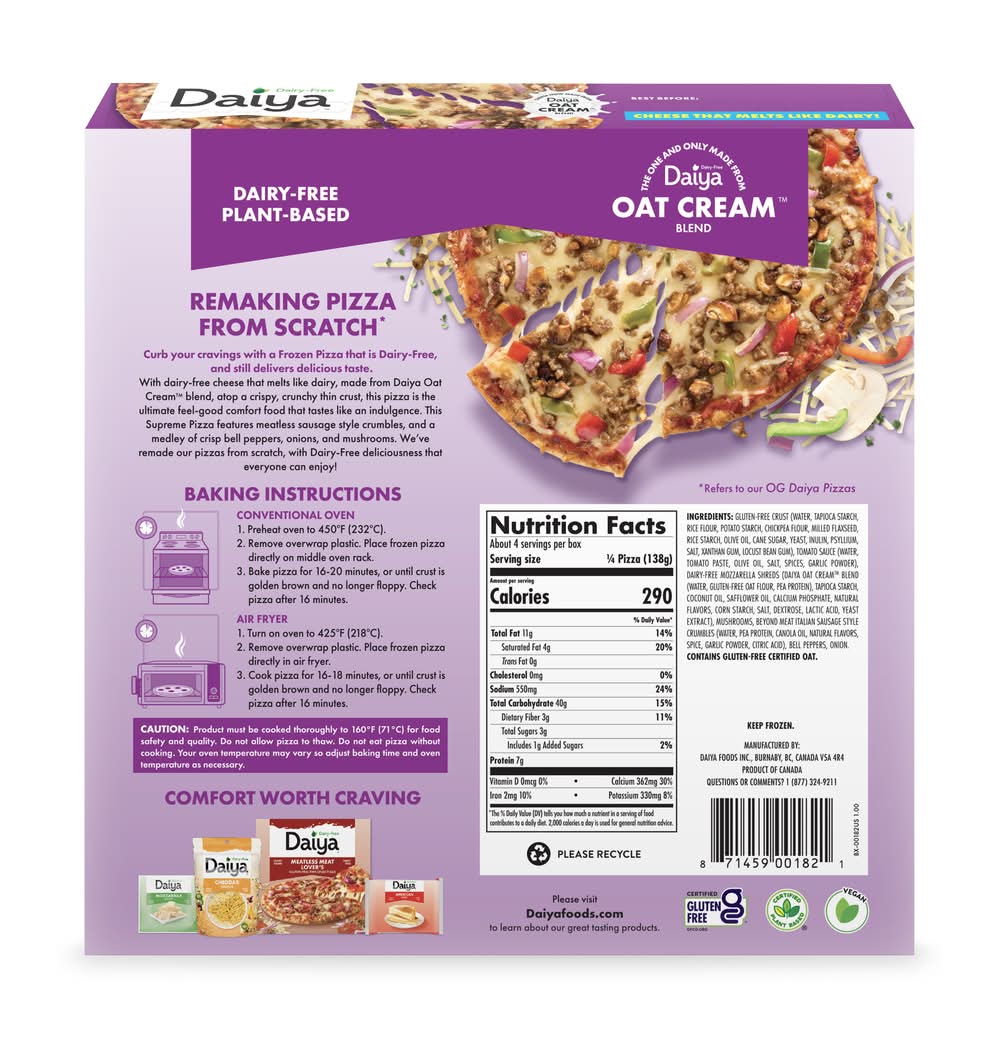 Plant based. Dairy free. Certified gluten free. gfco.org. Certified plant based. Vegan. Non-GMO Project verified. nongmoproject.org. Cheese that melts like dairy! Remaking pizza from scratch (refers to our OG Daiya Pizzas). Curb your cravings with a frozen pizza that is dairy-free, and still delivers delicious taste. With dairy-free cheese that melts like dairy, made from daiya oat cream blend, atop a crispy, crunchy thin crust, this pizza is the ultimate feel-good comfort food that tastes like an indulgence. This supreme pizza features meatless sausage style crumbles, and a medley of crisp bell peppers, onions, and mushrooms. We've remade our pizzas from scratch, with dairy-free deliciousness that everyone can enjoy! • Daiya Foods, Vancouver, BC, V5M 3T7 • Packaging: Reusable