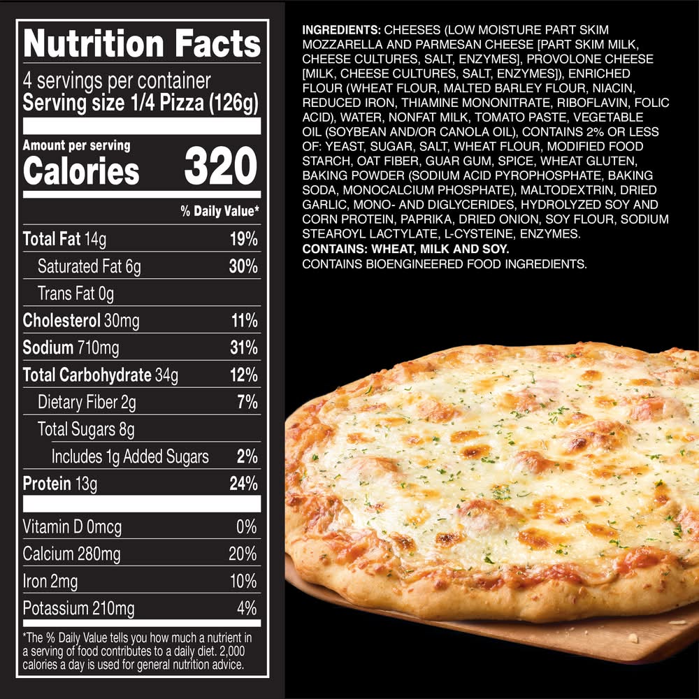 Is made with a blend of mozzarella, provolone, and Parmesan cheeses, complemented by parsley. It offers a source of protein and calcium. The product features a unique, crispy, bubbly, and golden brown crust. With its origins dating back to 1976, the presents a convenient option for meals. It contains bioengineered food ingredients and should be consumed with consideration to its fat, saturated fat, and sodium content as detailed in the nutritional information. Packaging: Reusable