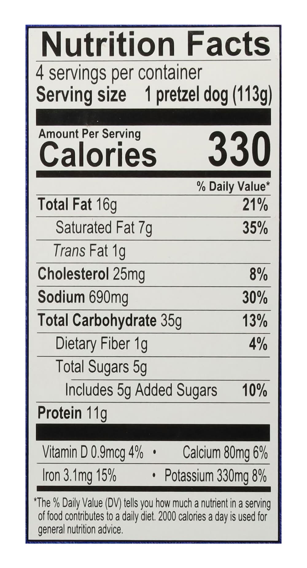 Ingredients: Pretzel Dough: Enriched Wheat Flour (Wheat Flour, Malted Barley Flour, Niacin, Iron, Thiamine Mononitrate, Riboflavin, Folic Acid), Water, Dark Brown Sugar, Yeast (Yeast, Sorbitan Monostearate, Ascorbic Acid), Dough Conditioner (Gum Arabic, Wheat Flour, Mono- and Diglycerides, Salt, Cellulose Gum, Guar Gum, Enzymes), Butter Flavor (Water, Propylene Glycol, Natural Flavors), Salt, Calcium Propionate, Soy Flour, Bicarbonates and Carbonates of Soda. Beef Frank: Beef, Water, Contains 2% or Less of Salt, Flavoring, Sorbitol, Potassium Lactate, Sodium Lactate, Sodium Phosphates, Sodium Diacetate, Sodium Erythorbate, Sodium Nitrite, Extract of Paprika Contains: Wheat, Barley, Soybeans