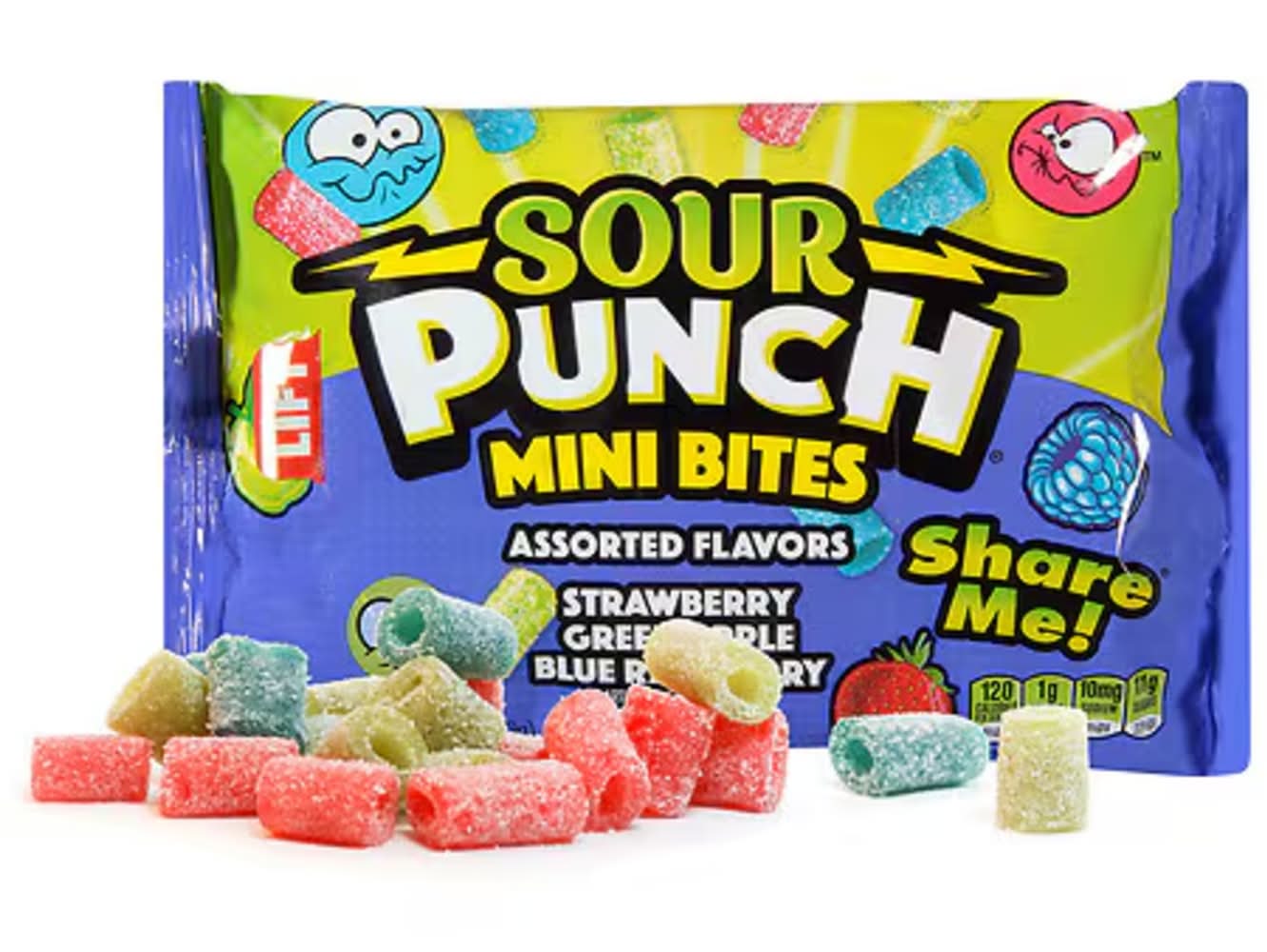 Sour Punch Mini Bites Assorted Flavors Candy offers a variety of artificially flavored options including strawberry, green apple, and blue raspberry. Each package contains approximately 3.5 servings, with 120 calories per serving. The nutritional content per serving includes 1 gram of saturated fat, 10 milligrams of sodium, and 11 grams of sugars. These candies are produced with genetic engineering and are manufactured in the United States. Number of servings: 3