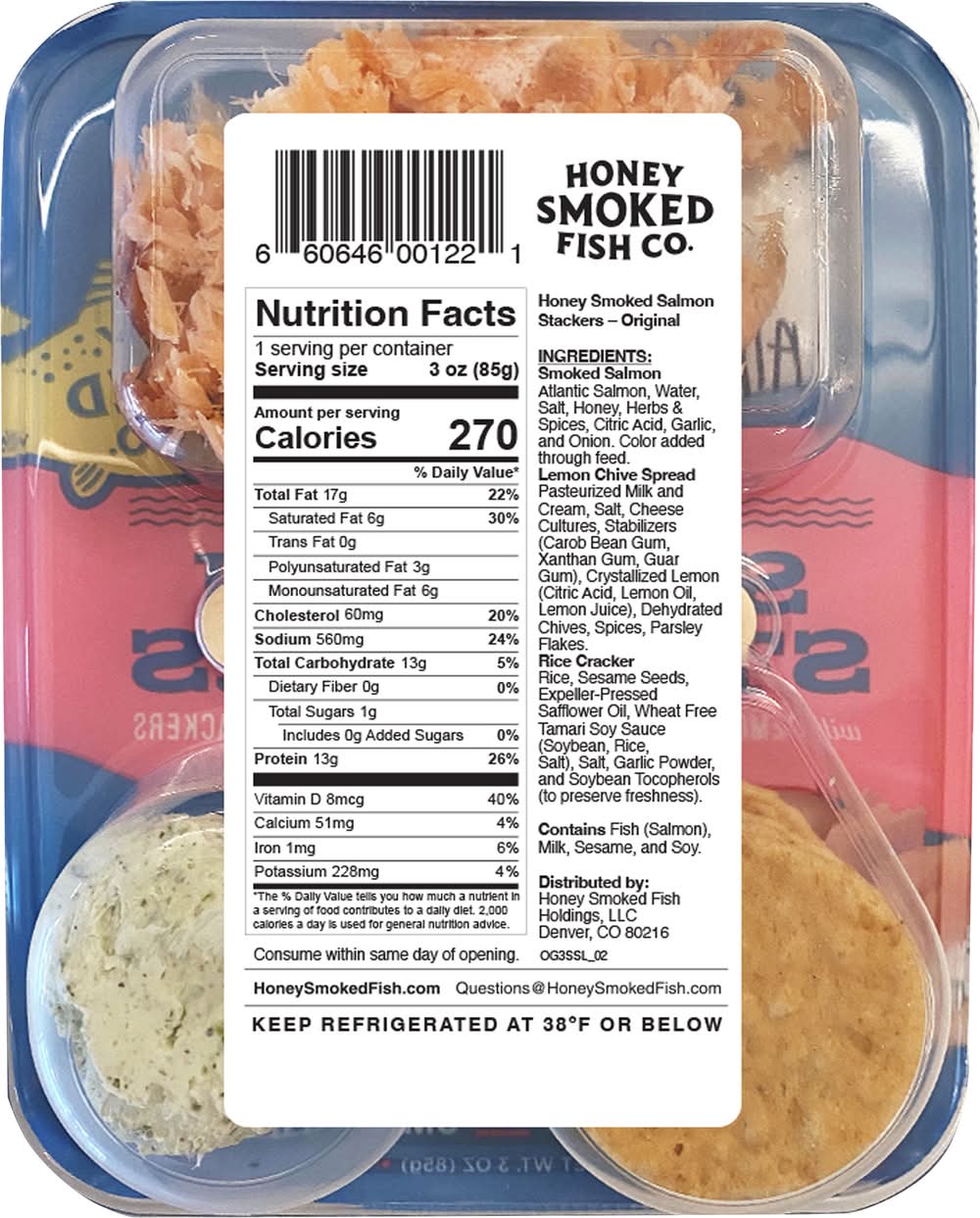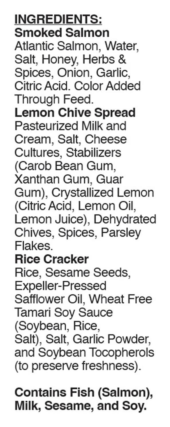 Ingredients: Smoked Salmon Atlantic Salmon, Water, Salt, Honey, Herbs & Spices, Citric Acid, Garlic, and Onion, Color Added Through Feed, Lemon Chive Spread Pasteurized Milk and Cream, Salt, Cheese Cultures, Stabilizers (Carob Bean Gum, Xanthan Gum, Guar Gum), Crystallized Lemon (Citric Acid, Lemon Oil, Lemon Juice), Dehydrated Chives, Spices, Parsley Flakes, Rice Cracker Rice, Sesame Seeds, Expeller-Pressed Safflower Oil, Wheat Free Tamari Soy Sauce (Soybean, Rice, Salt), Salt, Garlic Powder, and Soybean Tocopherols (to Preserve Freshness) Contains: Fish, Salmon, Milk, Sesame, Soybeans