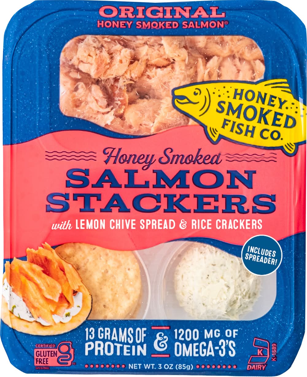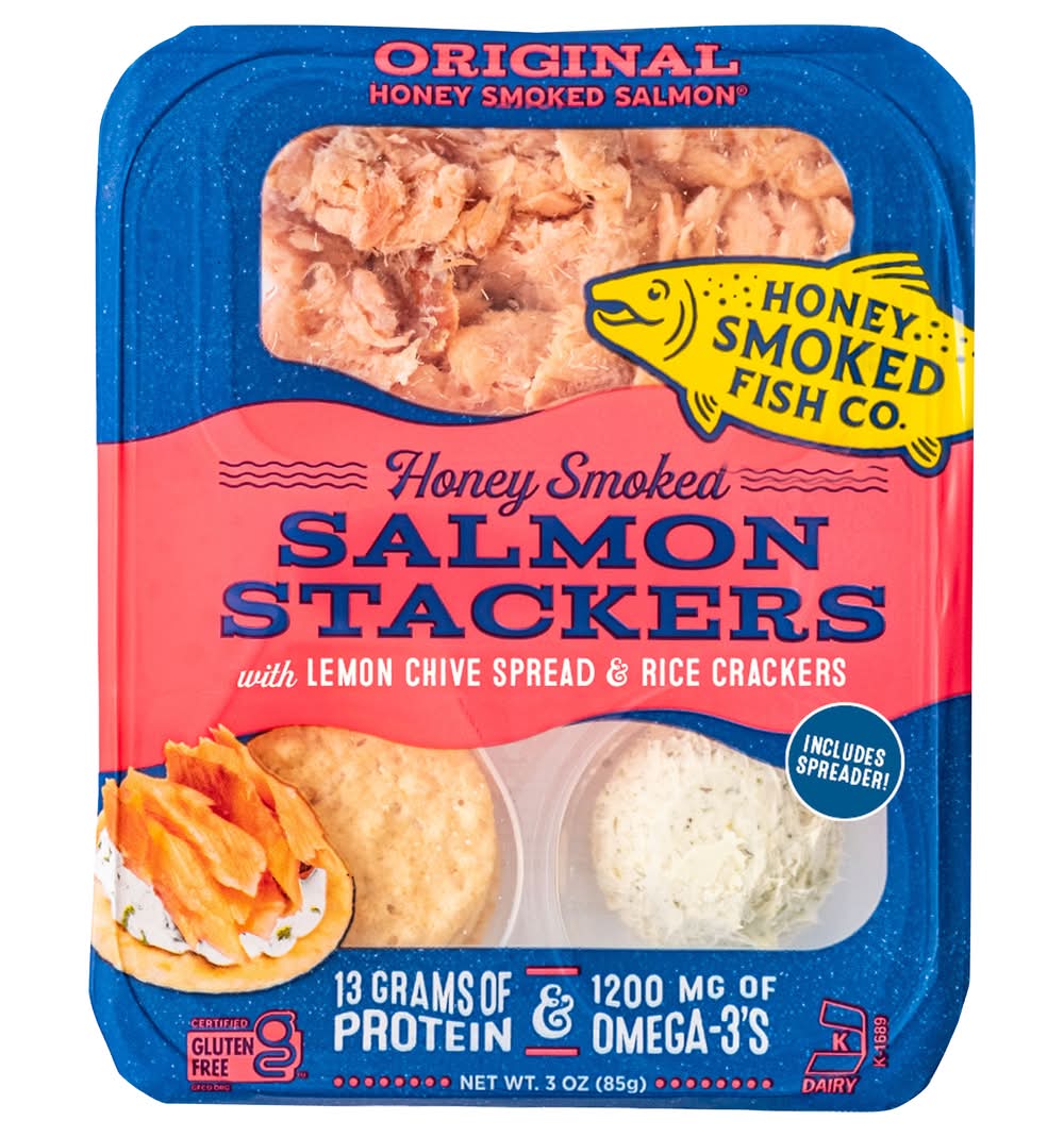 Honey-smoked salmon stackers kit with lemon-chive spread & rice crackers. Quick and easy lunch, after school snack, or a grab on the go snack anytime. Always fresh, never frozen. Our one-of-a-kind, salmon is fully cooked shortly after leaving the water and sealed tight as soon as it exits the small-batch smoker. *13 grams protein per serving *1200 mg omega-3 per serving *Certified gluten free *Small batch smoked *Fresh, never frozen *Snap eligible Keep refrigerated at or below 38℉. Use within same day of opening.