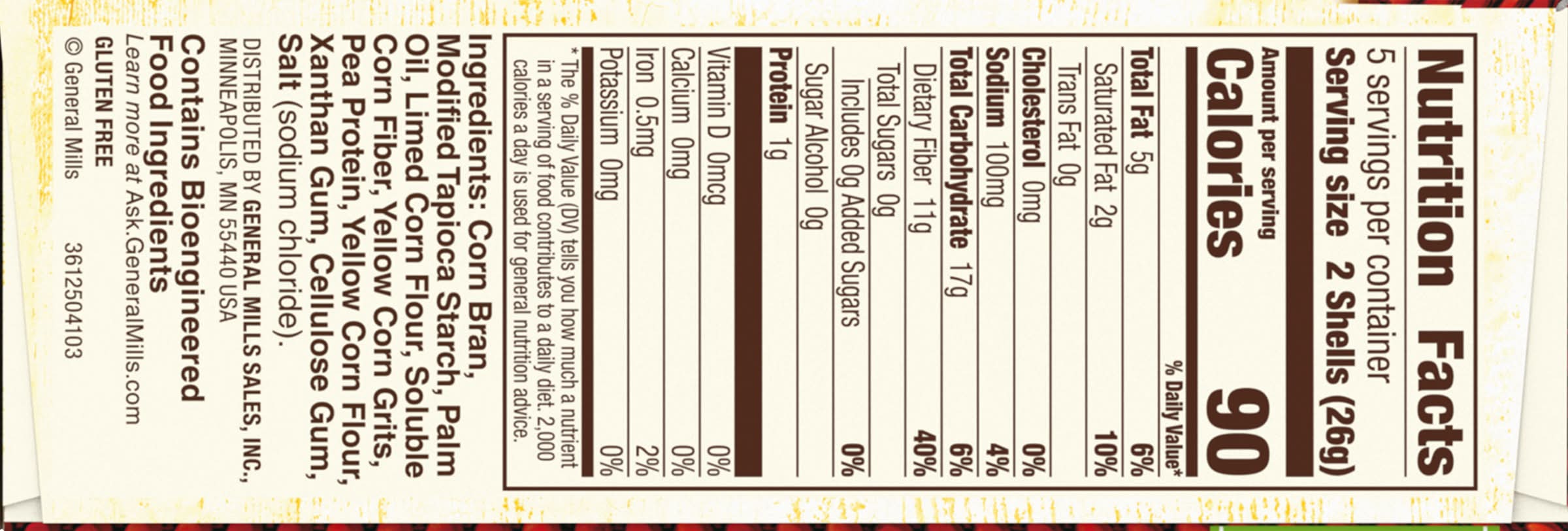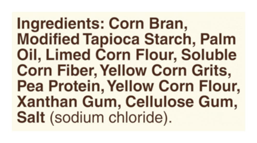 Ingredients: Corn Bran, Modified Tapioca Starch, Palm Oil, Limed Corn Flour, Soluble Corn Fiber, Yellow Corn Grits, Pea Protein, Yellow Corn Flour, Xanthan Gum, Cellulose Gum, Salt (Sodium Chloride). Contains: Corn (Maize) Additives: Genetically Modified Ingredients
