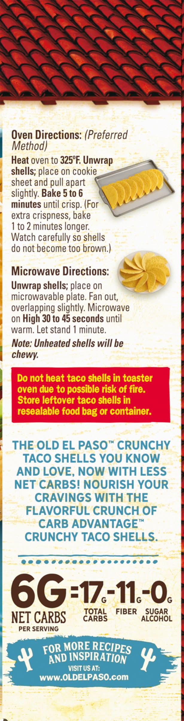 Directions for use: For Max Crunch, Heat 'Em up! Storage recommendation: Do not heat taco shells in toaster oven due to possible risk of fire. Store leftover taco shells in resealable food bag or container.