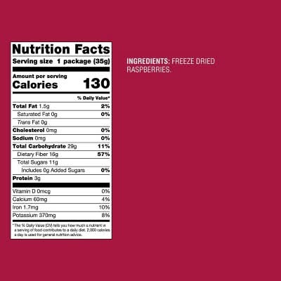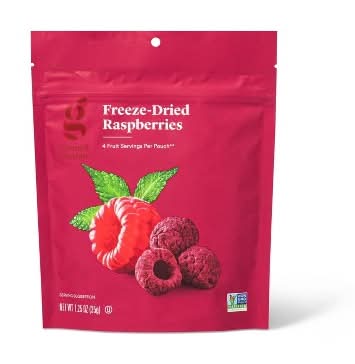 From your morning bowl of yogurt to an afternoon snack, add a burst of flavor to your kitchen with the Freeze-Dried Raspberries from Good & Gather Made without preservatives or additives and Non-GMO Project verified, these dried raspberries provide a convenient snack option that you'll love reaching for throughout the day, and with four servings of fruit in each pouch, they offer plenty of nutritional value. They're freeze-dried to remove water from the fruit while preserving flavor, and they come in a reclosable pouch, helping you maintain their freshness. Sprinkle these dried raspberry snacks over a homemade garden salad, or stir them into your breakfast cereal for an added fruity touch. Either way, you'll love the tasty convenience you've added to your kitchen. Every product that carries the Good & Gather name starts with quality ingredients that deliver great taste, making it easier for you and your family to eat well, every day.