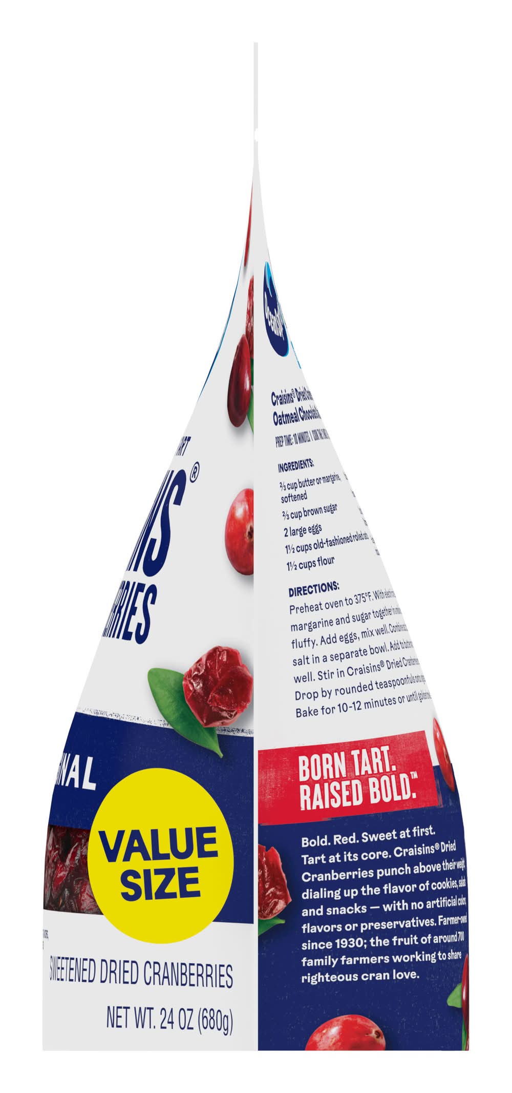 The original. The legend. Ocean Spray® Craisins® Original Dried Cranberries. Mouth-watering flavor and uncanny nutrition. This cranberry dried fruit product offers 25% of your daily recommended fruit.(1) No artificial flavors or preservatives. Enjoy real, bold dried cranberries in each pouch. don't let anything stand in the way of your Ocean Spray® Craisins® fix. Born Tart. Raised Bold.™ (1) Each ¼ cup serving of Craisins® Dried Cranberries provides ½ cup of fruit. The USDA MyPlate recommends a daily intake of 2 cups of fruit for a 2,000 calorie diet. • Ocean Spray Cranberries, Inc., Lakeville-Middleboro, MA, 02349 • Packaging: Reusable