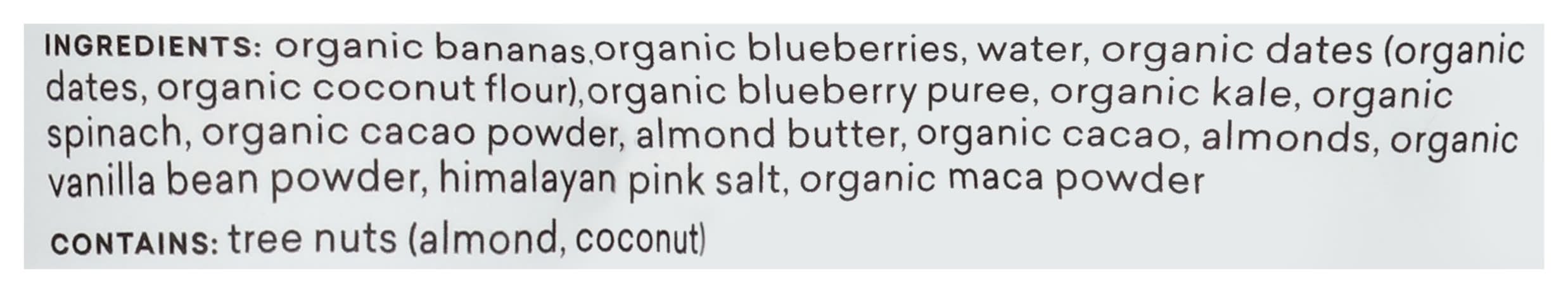 Ingredients: Organic Bananas, Organic Blueberries, Water, Organic Dates (Organic Dates, Organic Coconut Flour), Organic Blueberry Puree, Organic Kale, Organic Spinach, Organic Cacao Powder, Almond Butter, Organic Cacao, Almonds, Organic Vanilla Bean Powder, Himalayan Pink Salt, Organic Maca Powder Contains: Tree Nuts, Coconuts, Tree Nuts, Almonds