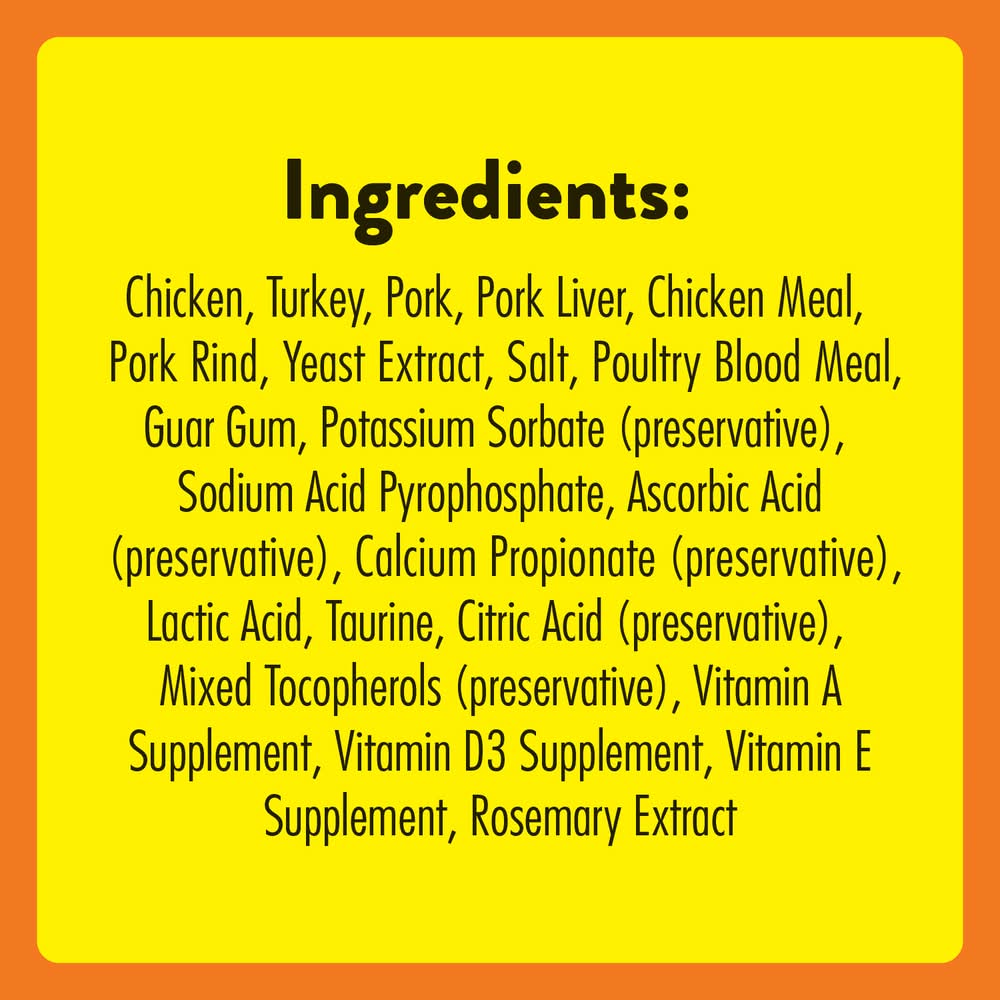 Ingredients: Chicken, Turkey, Pork, Pork Liver, Chicken Meal, Pork Rind, Yeast Extract, Salt, Poultry Blood Meal, Guar Gum, Potassium Sorbate (preservative), Sodium Acid Pyrophosphate, Ascorbic Acid (preservative), Calcium Propionate (preservative), Lactic Acid, Taurine, Citric Acid (preservative), Mixed Tocopherols (preservative), Vitamin A Supplement, Vitamin D3 Supplement, Vitamin E Supplement, Rosemary Extract