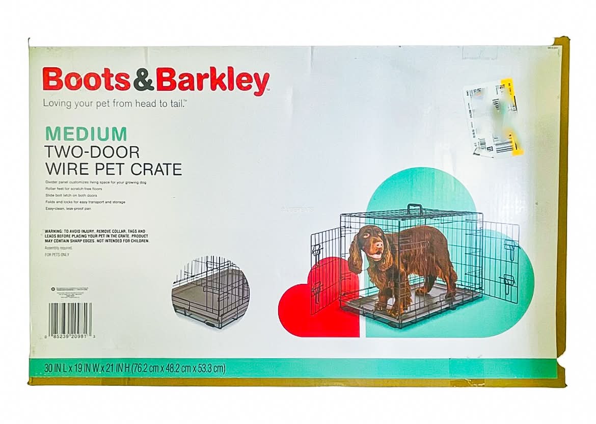 Designed for medium-sized dogs, the Boots & Barkley Wire Collapsible Dog Crate offers a well-ventilated space with its open, fence-style metal frame. Its collapsible nature allows for easy setup and convenient flat storage. The crate includes a plastic floor tray for effortless cleaning and a latched door to secure your pet. A divider panel is also provided to adjust the interior space as needed for your growing puppy, ensuring ample room for movement and relaxation. Add your dog's favorite toy and blanket to customize the space for comfort. • Color: Black • Size: Medium