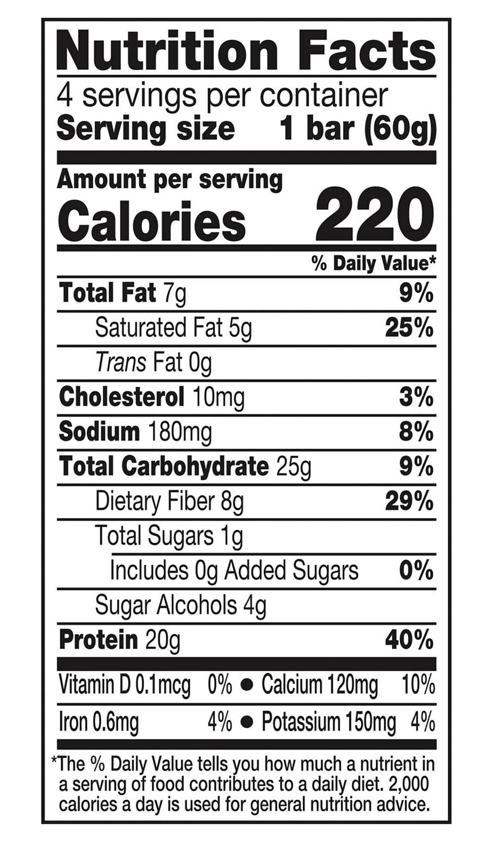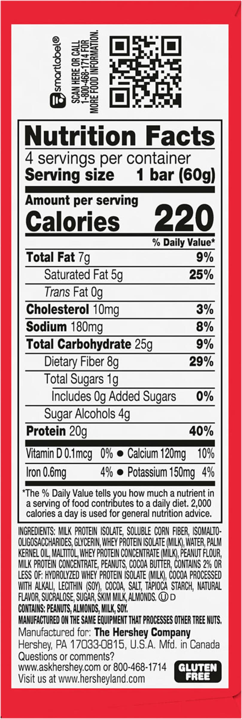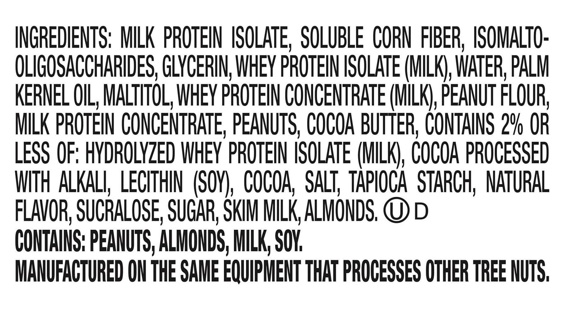 Ingredients: Milk Protein Isolate, Soluble Corn Fiber, Isomaltooligosaccharides, Glycerin, Whey Protein Isolate (Milk), Water, Palm Kernel Oil, Maltitol, Whey Protein Concentrate (Milk), Peanut Flour, Milk Protein Concentrate, Peanuts, Cocoa Butter, Contains 2% or Less of: Hydrolyzed Whey Protein Isolate (Milk), Cocoa Processed with Alkali, Lecithin (Soy), Cocoa, Salt, Tapioca Starch, Natural Flavor, Sucralose, Sugar, Skim Milk, Almonds Contains: Milk, Peanuts, Tree Nuts, Soybeans