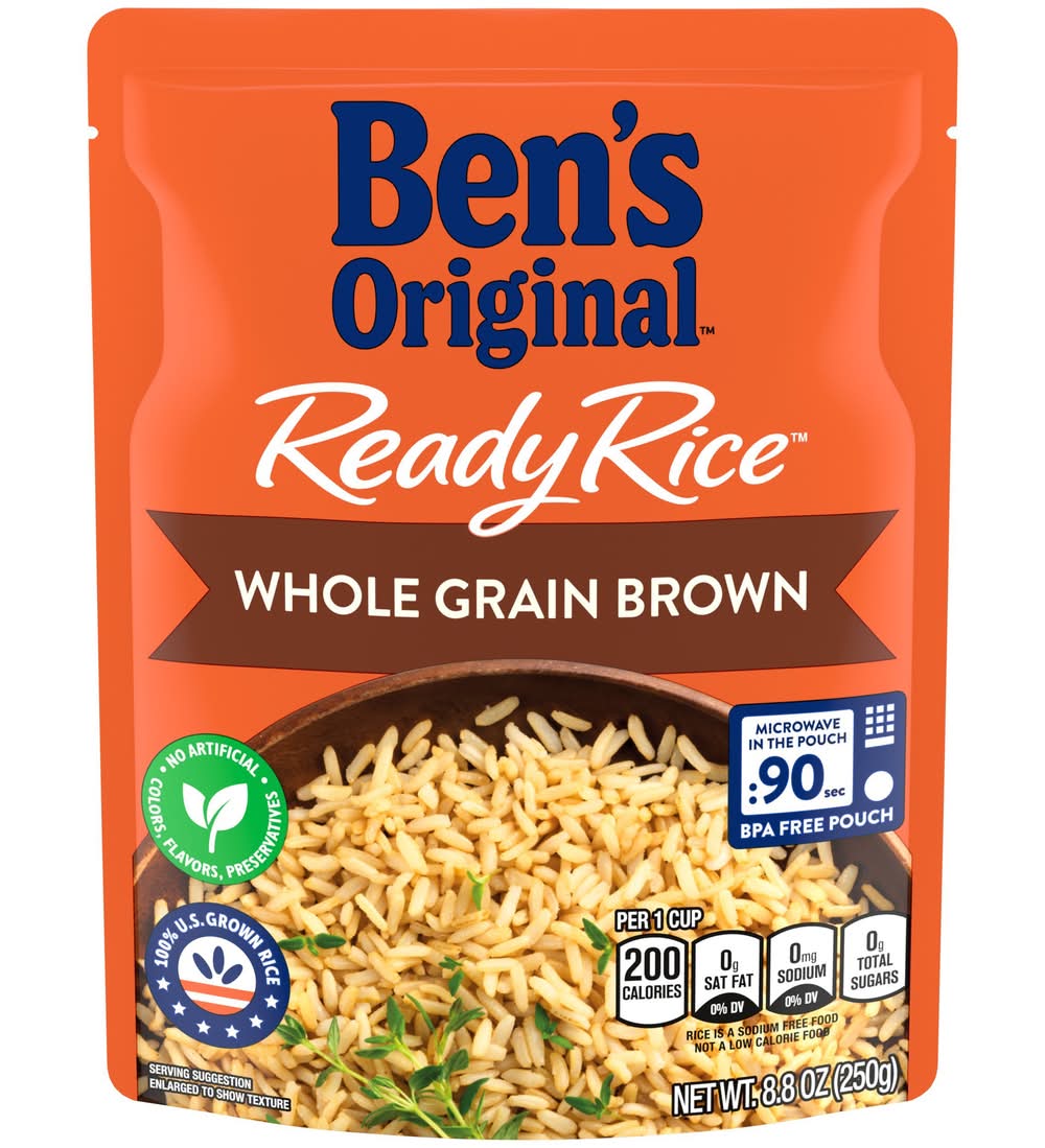 One pouch of BEN'S ORIGINAL Ready Rice Whole Grain Brown Rice Easy microwave rice that provides the delicious and wholesome taste of whole grain brown rice in just 90 seconds Each rice pouch contains parboiled long grain brown rice with a chewy texture and nutty aroma Serve this parboiled rice plain or pair it with your favorite meats and stir frys as a satisfying rice side dish Microwave the rice pouch for 90 seconds, or pour the contents into a skillet and heat thoroughly before serving Ready Rice makes it easy to create a tasty meal with a BPA-free microwave rice pouch that eliminates prep and cleanup BEN'S ORIGINAL Ready Rice Whole Grain Brown Rice provides the delicious and wholesome taste of whole grain brown rice in just 90 seconds. This parboiled long grain brown rice delivers a chewy texture and nutty aroma that makes it the perfect addition to all your cooked rice recipes. Ready Rice comes in a BPA-free microwave rice pouch that eliminates prep and cleanup, making it easier than ever to create a tasty meal. All you have to do is microwave the rice pouch for 90 seconds or pour the contents into a skillet and heat thoroughly before serving. Great as a satisfying rice side dish or as part of a savory main course, serve this parboiled rice plain or pair it with your favorite meats and stir frys. This whole grain brown rice is vegetarian, made with 100% whole grains, contains no artificial flavors, no artificial colors, no preservatives, trans fat, or cholesterol. Ben's Original is dedicated to creating meals and experiences that offer everyone a seat at the table. • Mars food US, LLC, PO Box 221660,Chicago,IL,60622,USA • Packaging: Reusable