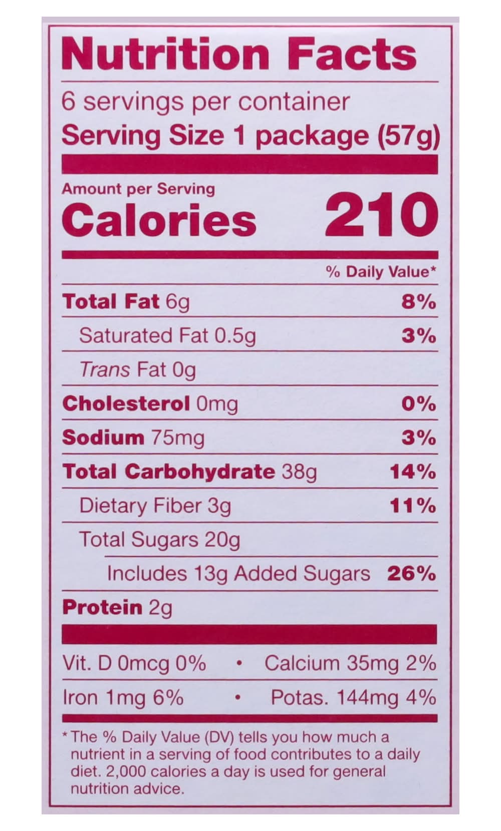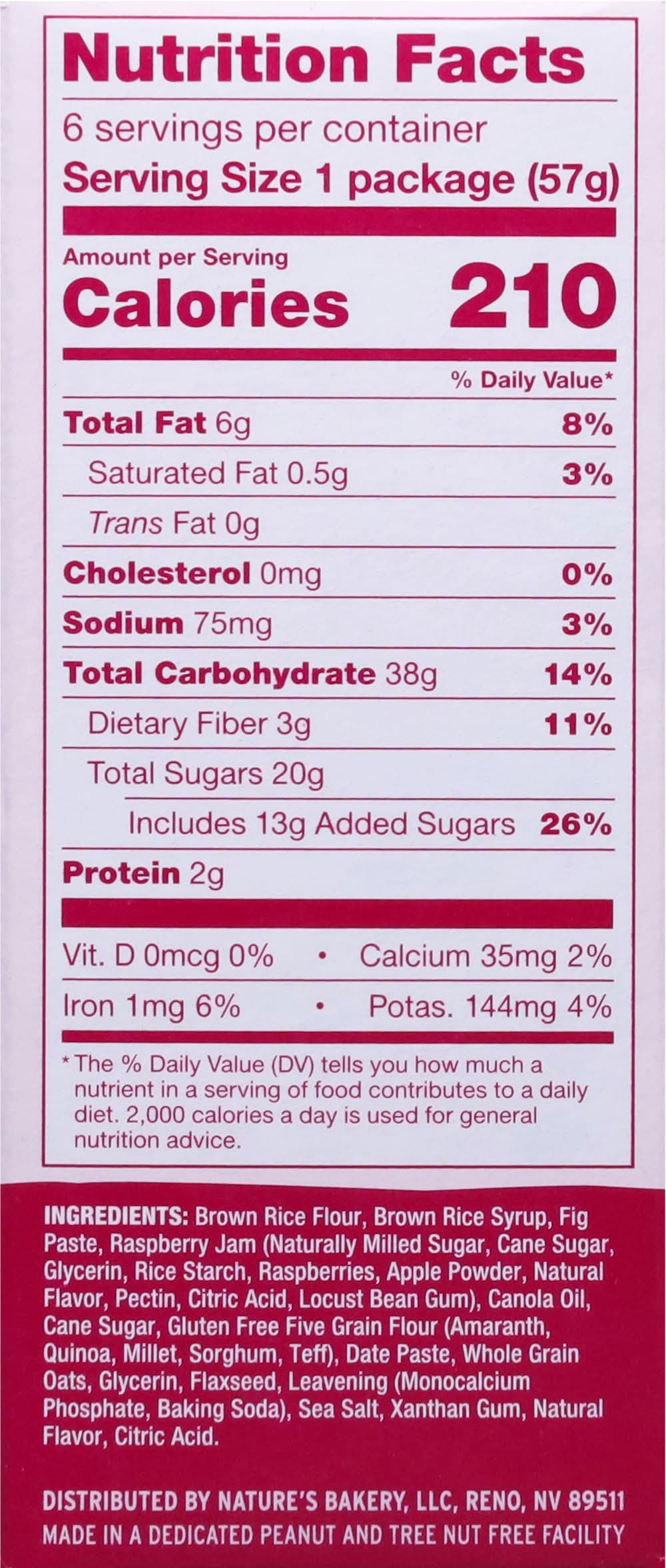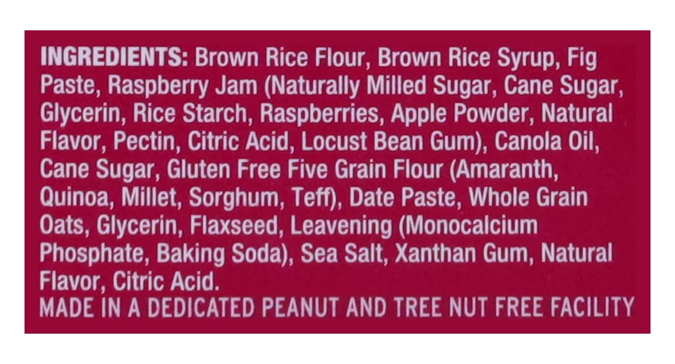 Ingredients: Brown Rice Flour, Brown Rice Syrup, Fig Paste, Raspberry Jam (Naturally Milled Sugar, Cane Sugar, Glycerin, Rice Starch, Raspberries, Apple Powder, Natural Flavor, Pectin, Citric Acid, Locust Bean Gum), Canola Oil, Cane Sugar, Gluten Free Five Grain Flour (Amaranth, Quinoa, Millet, Sorghum, Teff), Date Paste, Whole Grain Oats, Glycerin, Flaxseed, Leavening (Monocalcium Phosphate, Baking Soda), Sea Salt, Xanthan Gum, Natural Flavor, Citric Acid