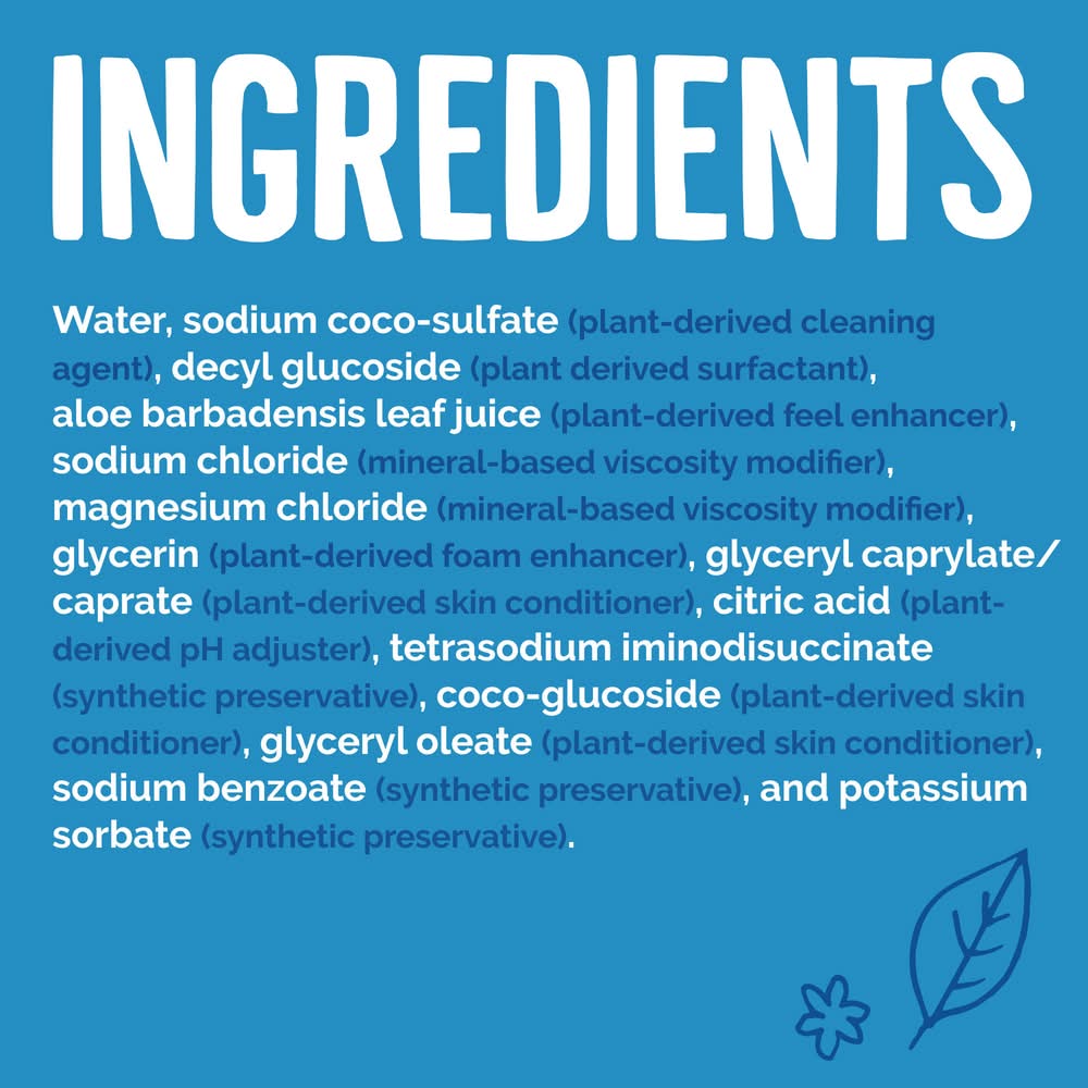 Ingredients: Water, sodium coco-sulfate (plant-derived cleaning agent), decyl glucoside (plant-derived surfactant), aloe barbadensis leaf juice (plant-derived feel enhancer), sodium chloride (mineral-based viscosity modifier), magnesium chloride (mineral-based viscosity modifier), glycerin (plant-derived foam enhancer), glyceryl caprylate/caprate (plant-derived skin conditioner), citric acid (plant-derived pH adjuster), tetrasodium iminodisuccinate (synthetic preservative enhancer), coco-glucoside (plant-derived skin conditioner), glyceryl oleate (plant-derived skin conditioner), and sodium benzoate and potassium sorbate (synthetic preservatives).