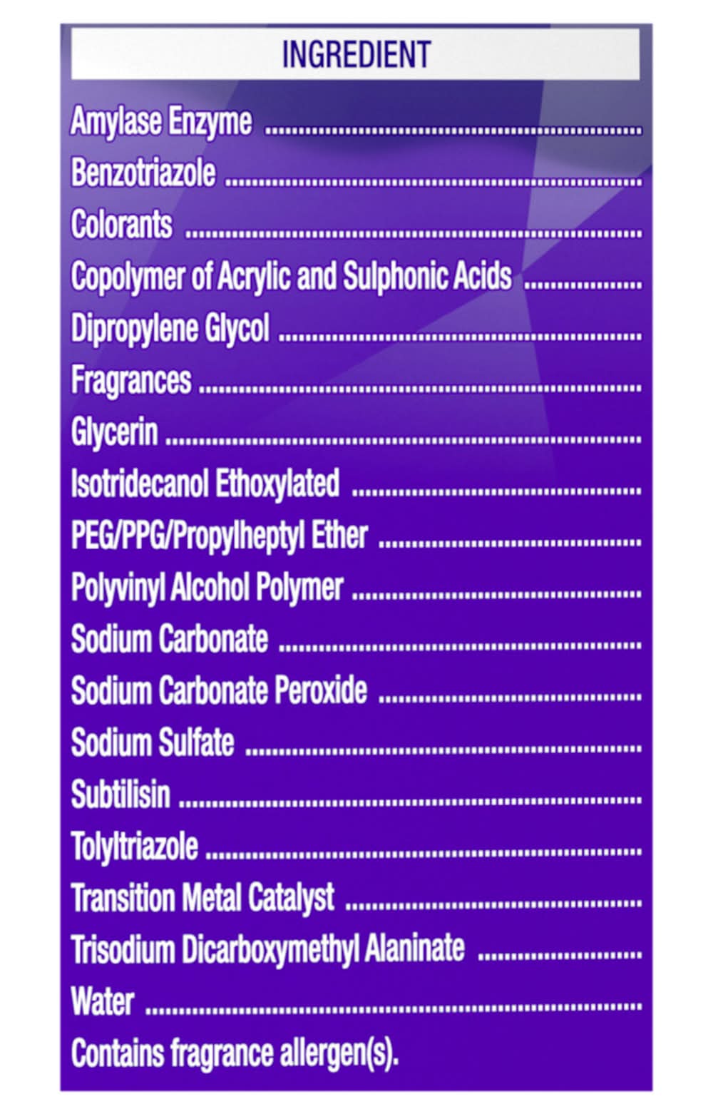 Ingredients: Amylase Enzyme, Benzotriazole, Colorants, Copolymer of Acrylic and Sulphonic Acids, Dipropylene Glycol, Fragrances, Glycerin, Isotridecanol Ethoxylated, PEG/PPG/Propylheptyl Ether, Polyvinyl Alcohol Polymer, Sodium Carbonate, Sodium Carbonate Peroxide, Sodium Sulfate, Subtilisin, Tolyltriazole, Transition Metal Catalyst, Trisodium Dicarboxymethyl Alaninate, Water