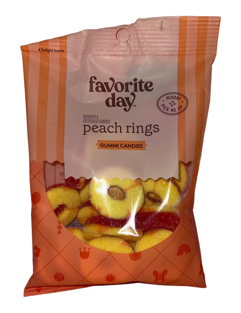 Sweeten up your day with these Peach Rings from Favorite Day™. These peach rings feature a round shape and chewy texture for a snack that's perfect for enjoying while you watch a movie or while road-tripping across the country. You can also use them for other desserts like ice cream or pudding dirt cups. This pack comes with 7 ounces of peach rings so you take them with you wherever you go. Perfect as an on-the-go snack, these sweet peach rings are a must-have to satisfy your sweet tooth. A little bliss in every bite. Guaranteed to be a favorite or your money back.