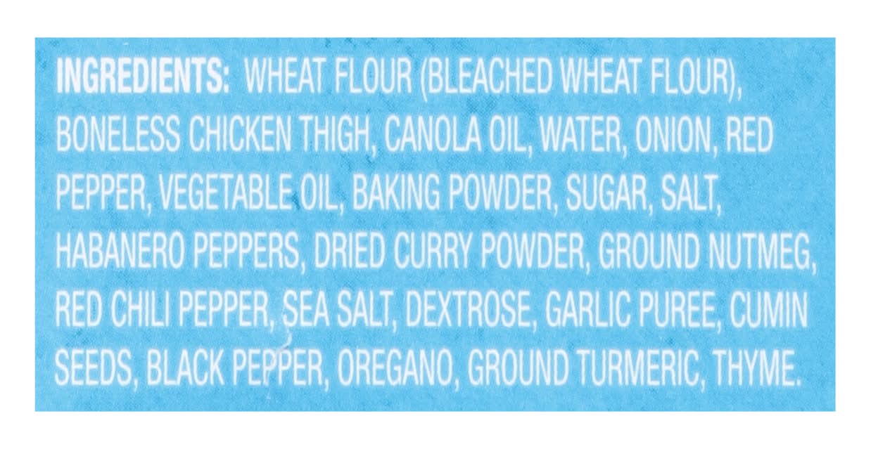 Ingredients: Wheat Flour (Bleached Wheat Flour), Boneless Chicken Thigh, Canola Oil, Water, Onion, Red Pepper, Vegetable Oil, Baking Powder, Sugar, Salt, Habanero Peppers, Dried Curry Powder, Ground Nutmeg, Red Chili Pepper, Sea Salt, Dextrose, Garlic Puree, Cumin Seeds, Black Pepper, Oregano, Ground Turmeric, Thyme Contains: Wheat