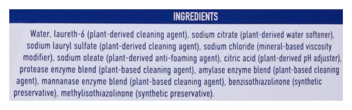 Ingredients: Water, Laureth-6 (Plant-Derived Cleaning Agent), Sodium Citrate (Plant-Derived Water Softener), Sodium Lauryl Sulfate (Plant-Derived Cleaning Agent), Sodium Chloride (Mineral-Based Viscosity Modifier), Sodium Oleate (Plant-Derived Anti-Foaming Agent), Citric Acid (Plant-Derived pH Adjuster), Protease Enzyme Blend (Plant-Based Cleaning Agent), Amylase Enzyme Blend (Plant-Based Cleaning Agent), Mannanase Enzyme Blend (Plant-Based Cleaning Agent), Benzisothiazolinone (Synthetic Preservative), Methylisothiazolinone (Synthetic Preservative)
