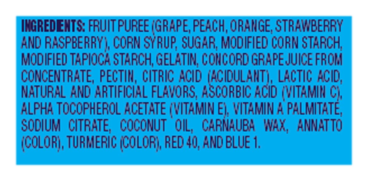 Ingredients: Fruit Puree (Grape, Peach, Orange, Strawberry and Raspberry), Corn Syrup, Sugar, Modified Corn Starch, Modified Tapioca Starch, Gelatin, Concord Grape Juice from Concentrate, Pectin, Citric Acid (Acidulant), Lactic Acid, Natural and Artificial Flavors, Ascorbic Acid (Vitamin C), Alpha Tocopherol Acetate (Vitamin E), Vitamin A Palmitate, Sodium Citrate, Coconut Oil, Carnauba Wax, Annatto (Color), Turmeric (Color), Red 40, and Blue 1 Contains: Corn, Tree Nuts, Coconuts
