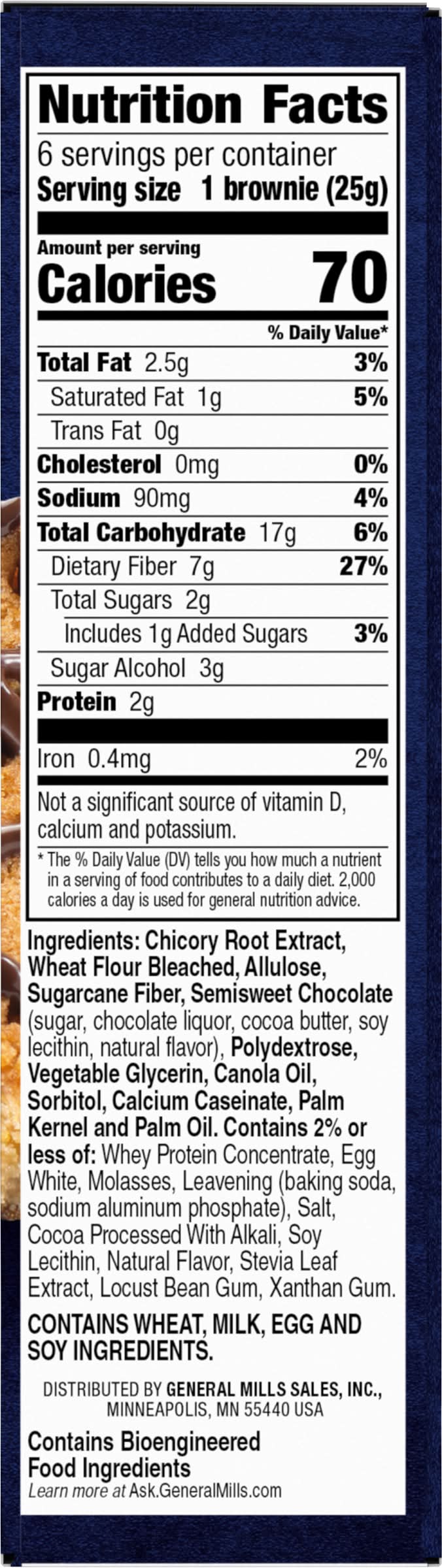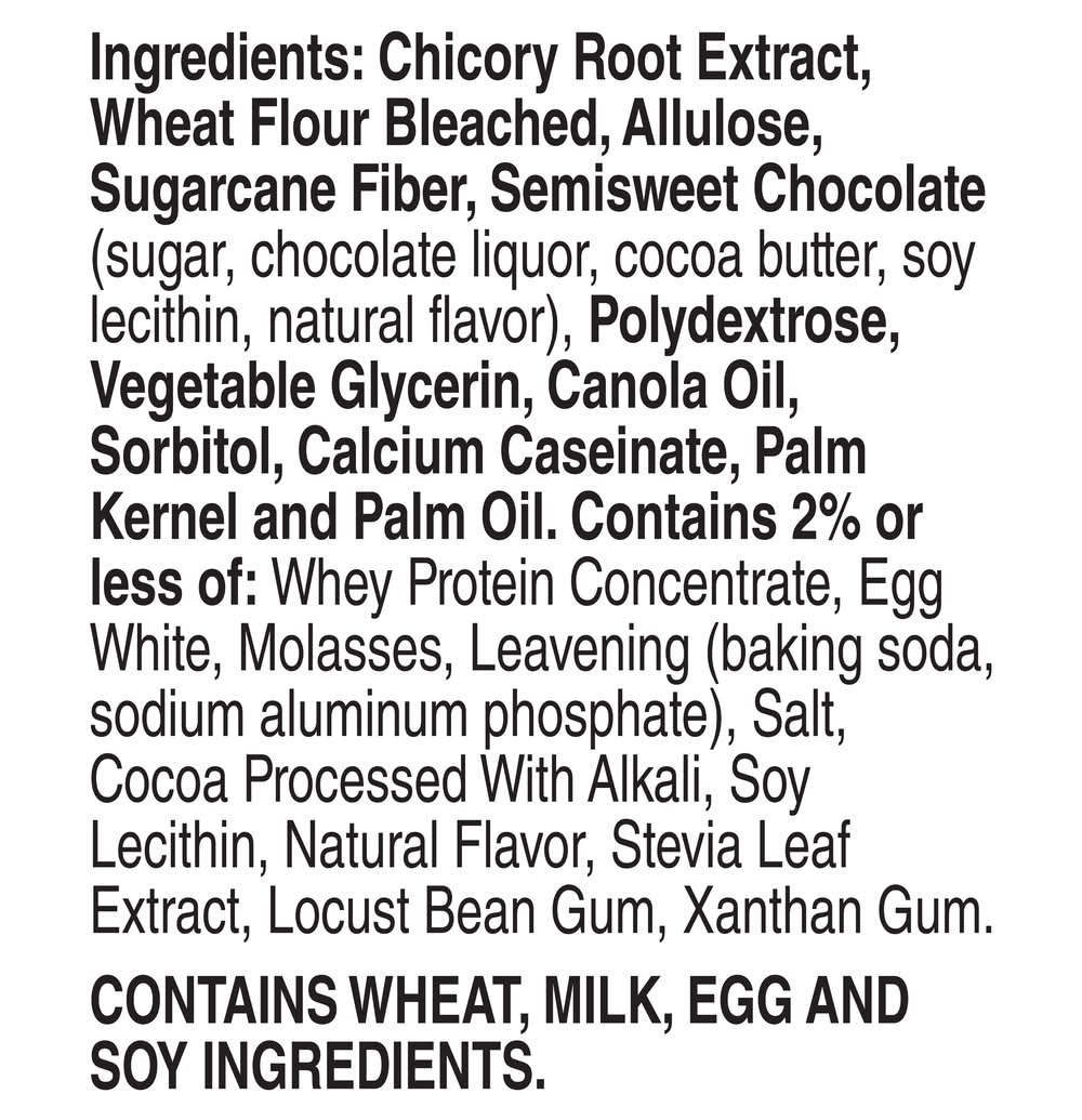 Ingredients: Chicory Root Extract, Wheat Flour Bleached, Allulose, Sugarcane Fiber, Semisweet Chocolate (Sugar, Chocolate Liquor, Cocoa Butter, Soy Lecithin, Natural Flavor), Polydextrose, Vegetable Glycerin, Canola Oil, Sorbitol, Calcium Caseinate, Palm Kernel and Palm Oil. Contains 2% or Less of: Whey Protein Concentrate, Egg White, Molasses, Leavening (Baking Soda, Sodium Aluminum Phosphate), Salt, Cocoa Processed with Alkali, Soy Lecithin, Natural Flavor, Stevia Leaf Extract, Locust Bean Gum, Xanthan Gum Contains: Wheat, Milk, Eggs, Soybeans