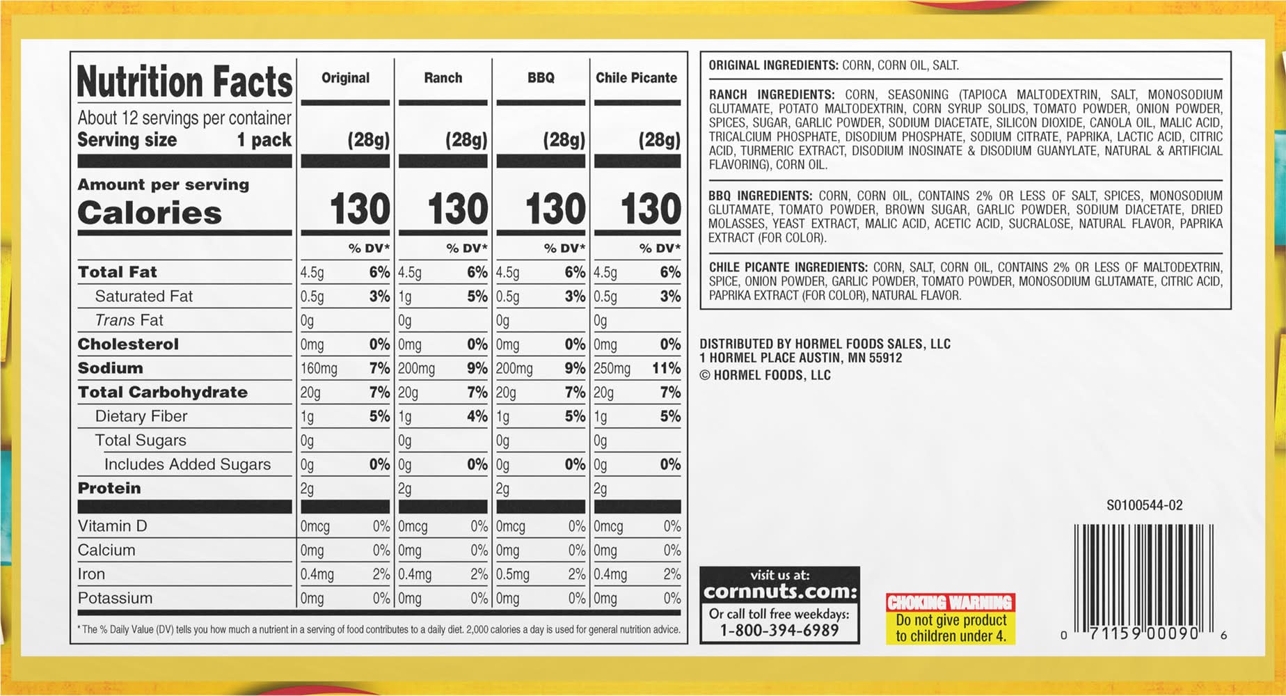 Ingredients: BBQ: Bbq Ingredients: Corn, Corn Oil, Contains 2% or Less of Salt, Spices, Monosodium Glutamate, Tomato Powder, Brown Sugar, Garlic Powder, Sodium Diacetate, Dried Molasses, Yeast Extract, Malic Acid, Acetic Acid, Sucralose, Natural Flavor, Paprika Extract (for Color). Chile Picante: Chile Picante Ingredients: Corn, Salt, Corn Oil, Contains 2% or Less of Maltodextrin, Spice, Onion Powder, Garlic Powder, Tomato Powder, Monosodium Glutamate, Citric Acid, Paprika Extract (for Color), Natural Flavor. Original: Original Ingredients: Corn, Corn Oil, Salt. Ranch: Ranch Ingredients: Corn, Seasoning (Tapioca Maltodextrin, Salt, Monosodium Glutamate, Potato Maltodextrin, Corn Syrup Solids, Tomato Powder, Onion Powder, Spices, Sugar, Garlic Powder, Sodium Diacetate, Silicon Dioxide, Canola Oil, Malic Acid, Tricalcium Phosphate, Disodium Phosphate, Sodium Citrate, Paprika, Lactic Acid, Citric Acid, Turmeric Extract, Disodium Inosinate & Disodium Guanylate, Natural & Artificial Flavoring), Corn Oil. Contains: Corn