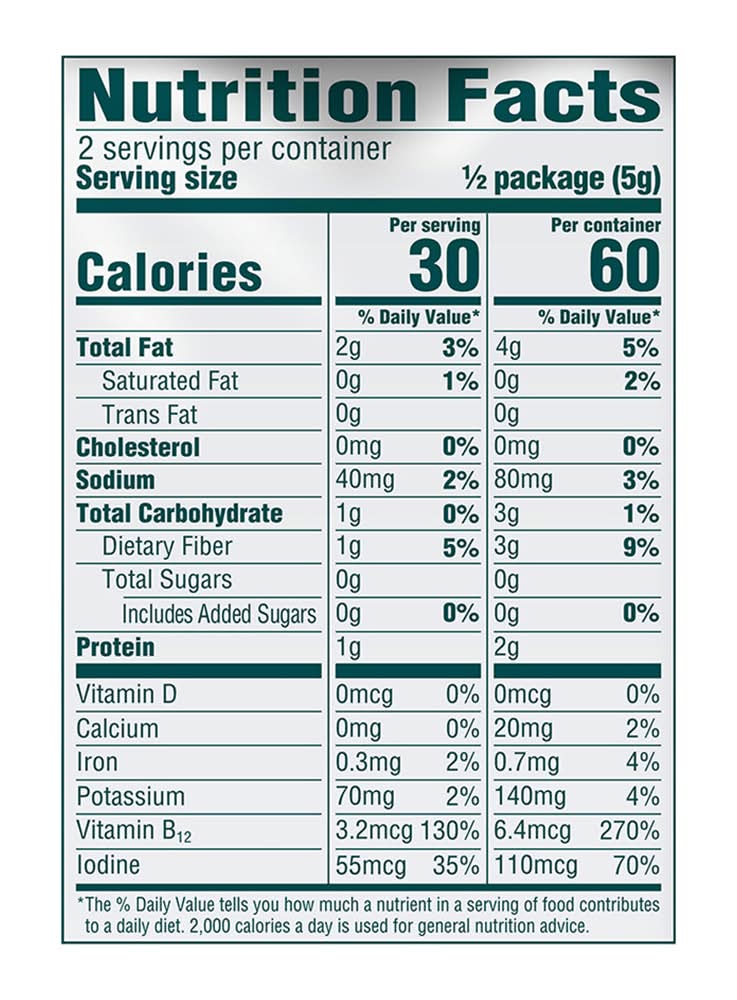 Ingredients: Seaweed*, Sunflower Oil*, Sea Salt. * Organic Contains: Soybeans, Sesame