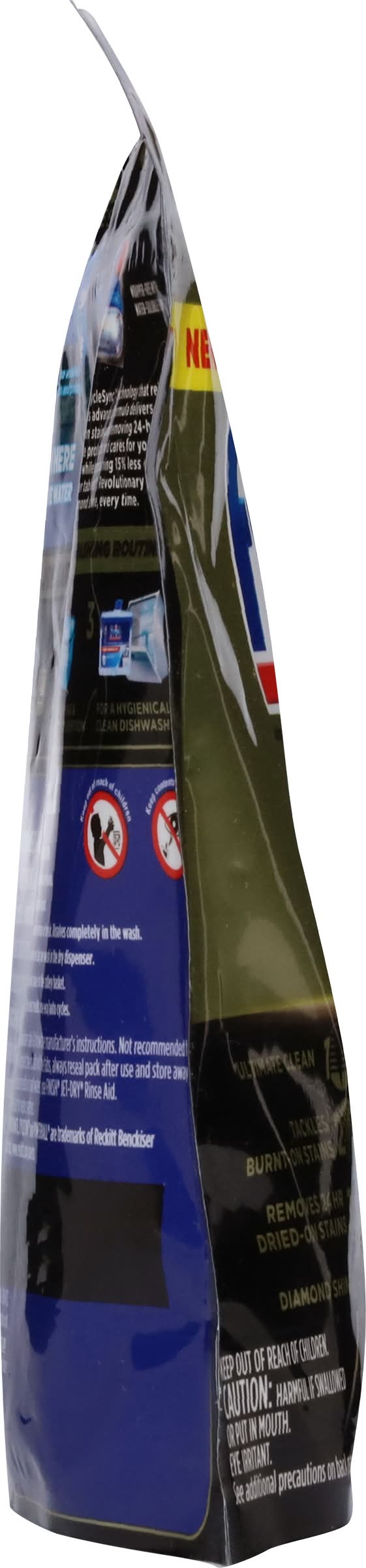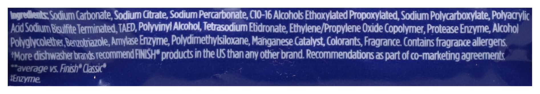 No.1 recommended in America. Recommended by more dishwasher brands in the US (more dishwasher brands recommend Finish products in the US than any other brand. Recommendations as part of co-marketing agreements). Skip the rinse start with finish. Automatic dishwasher detergent. Our best clean & shine. 1. Ultimate clean. 2. Tackles burnt-on stains. 3. Removes 24hr dried-on stains. 4. Diamond shine. Cyclesync. Right ingredient (enzyme). Right time. Skip the rinse. Start with finish. Save up to 20 gallons with every load. Wrapper-free with water-soluble film. Finish Ultimate is our first ever tablet with CycleSync technology that releases the right ingredient: to act at the right time. Its advanced formula delivers 4 actions throughout the wash cycle, tackling burnt-on stains and removing 24-hour dried-on stains, without pre-rinsing. Finish Ultimate protects and cares for your glassware, maintaining their shine wash after wash. All while containing 15% less chemical weight than Finish's traditional hard pressed powder tablets (average vs. Finish Classic). Revolutionary performance for the ultimate clean and diamond shine, every time. Finish Ultimate is safe for septic systems.