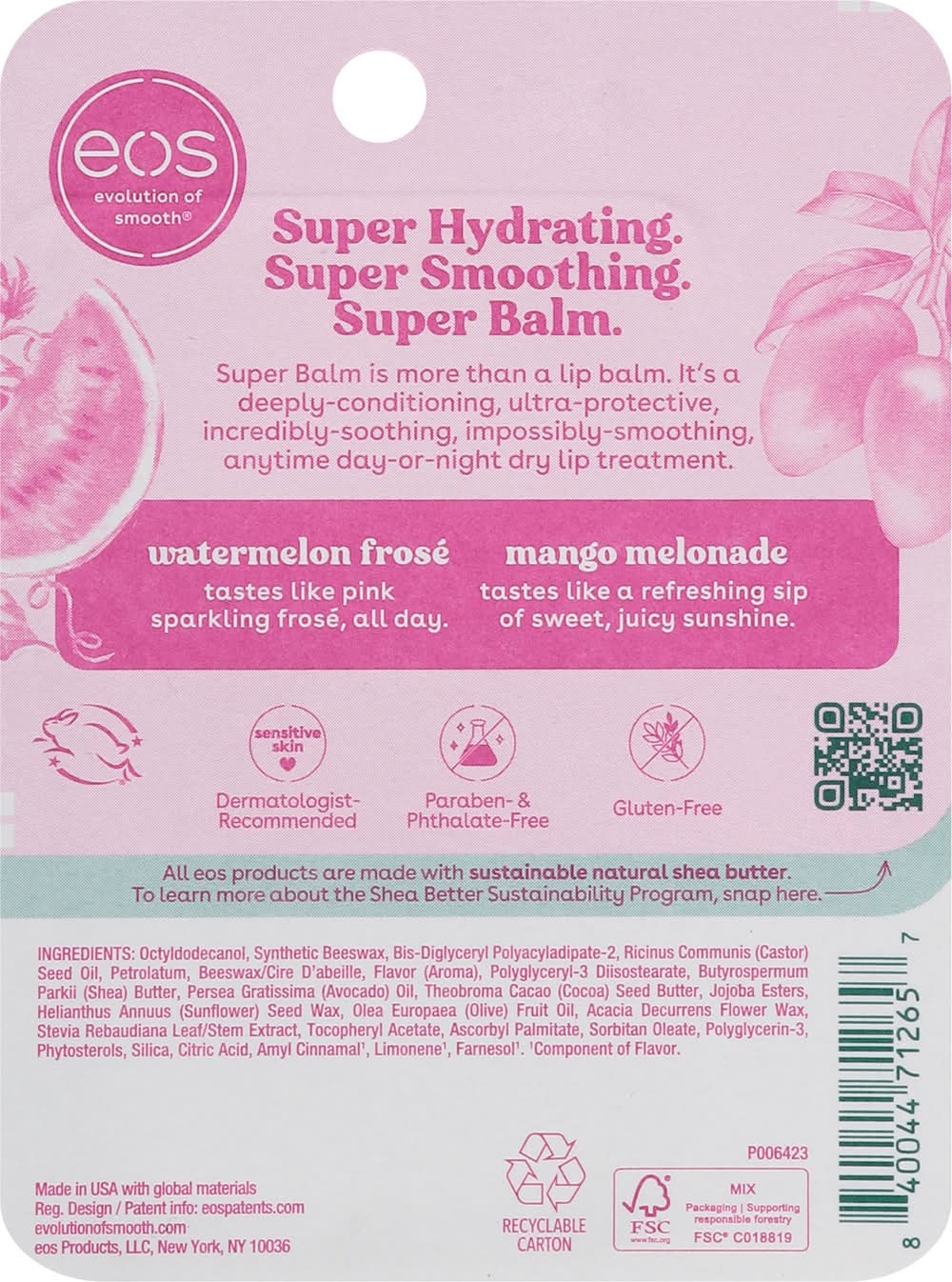 Cocoa; Shea; Avocado. Gluten-free. Evolution of Smooth. 3 Hydrating Butters: cocoa; shea; avocado. Made for sensitive skin. Super hydrating. Super smoothing. Super balm. Super Balm is more than a lip balm. It's a deeply-conditioning, ultra-protective, incredibly-soothing, impossibly-smoothing, anytime day-or-night dry lip treatment. Watermelon Frose: Taste like pink sparkling frose, all day. Mango Melonade: Taste like a refreshing sip of sweet, juicy sunshine. Sensitive skin. Packaging: Reusable