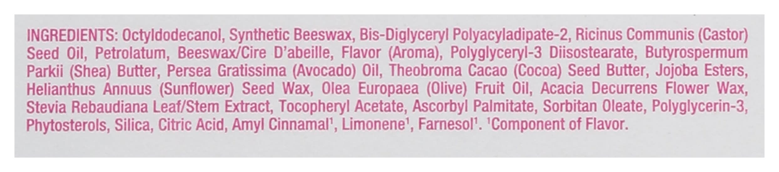 Ingredients: Octyldodecanol, Synthetic Beeswax, Bis-Diglyceryl Polyacyladipate-2, Ricinus Communis (Castor) Seed Oil, Petrolatum, Beeswax/Cire D'abeille, Flavor (Aroma), Polyglyceryl-3 Diisostearate, Butyrospermum Parkii (Shea) Butter, Persea Gratissima (Avocado) Oil, Theobroma Cacao (Cocoa) Seed Butter, Jojoba Esters, Helianthus Annuus (Sunflower) Seed Wax, Olea Europaea (Olive) Fruit Oil, Acacia Decurrens Flower Wax, Stevia Rebaudiana Leaf/Stem Extract, Tocopheryl Acetate, Ascorbyl Palmitate, Sorbitan Oleate, Polyglycerin-3, Phytosterols, Silica, Citric Acid, Amyl Cinnamal (Component of Flavor), Limonene (Component of Flavor), Farnesol (Component of Flavor) Contains: Tree Nuts, Sheanuts