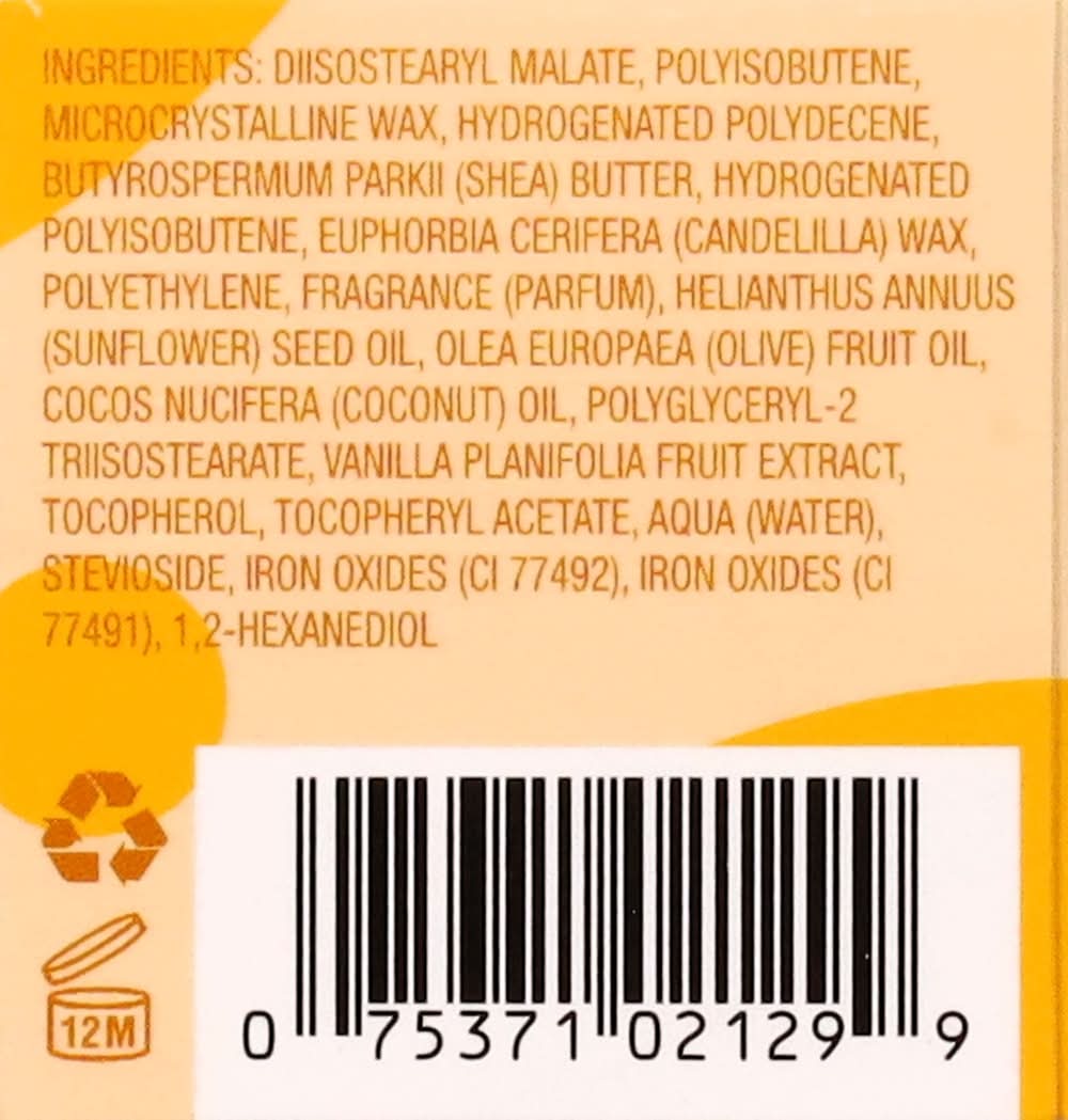 Ingredients: Diistostearyl Malate, Polyisobutene, Microcrystalline, Wax, Hydrogenated Polydecene Butyrospermum Parkii (Shea) Butter, Hydrogenated Polyisobutene, Euphorbia Cerifera (Candelilla) Wax, Polyethylene, Fragrance (Parfum), Helianthus Annuus (Sunflower) Seed Oil, Olea Europea (Olive) Fruit Oil, Cocos Nucifera (Coconut) Oil, Polyglyceryl-2 Triisostearate, Vanilla Planifolia Fruit Extract, Tocopherol, Tocopheryl Acetate, Aqua (Water), Stevioside, Iron Oxides (CI 77492), Iron Oxides (CI 77491), 1.2 – Hexanediol