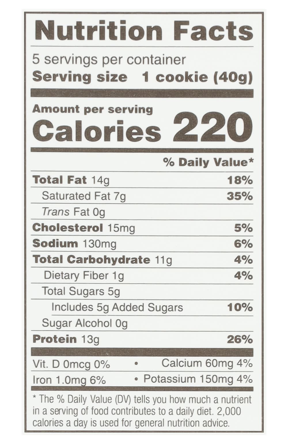 Ingredients: Proto Whey Protein Blend (Micro Peptides from High-Dh Hydrolyzed Whey Protein, Whey Protein Isolate, Milk Protein Isolate), Palm Oil, Enriched Flour (Wheat Flour, Malted Barley Flour, Niacin, Reduced Iron, Thiamine Mononitrate, Riboflavin, Folic Acid), Palm Kernel Oil, Sugar, Canola Oil, Cocoa Processed with Alkali, Fructose, Natural Flavors, Soy Lecithin, Maltodextrin, Salt, Stevia Leaf Extract, Baking Soda, Ammonium Bicarbonate, Monk Fruit Contains: Milk, Wheat, Soybeans, Barley, Peanuts