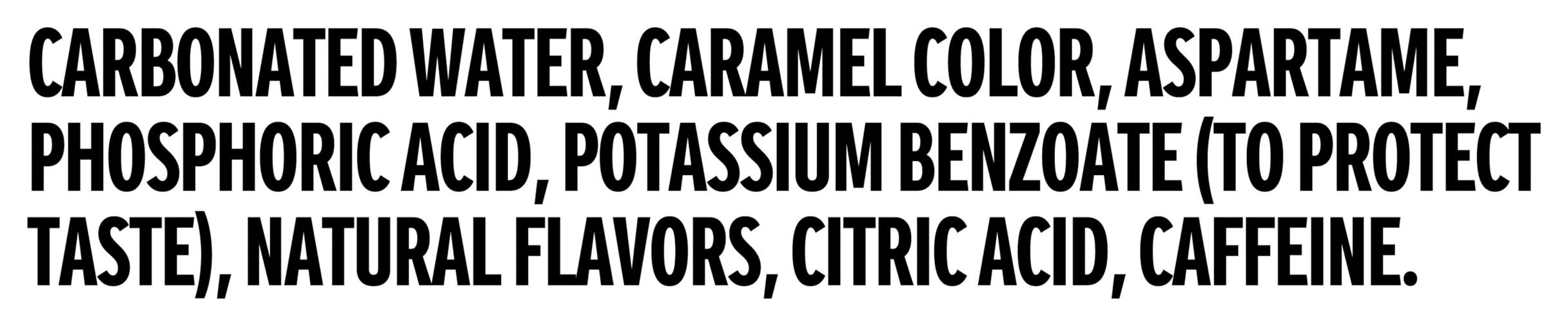 Ingredients: Carbonated Water, Caramel Color, Aspartame, Phosphoric Acid, Potassium Benzoate (to Protect Taste), Natural Flavors, Citric Acid, Caffeine Contains: Phenylalanine Contains 46mg of caffeine
